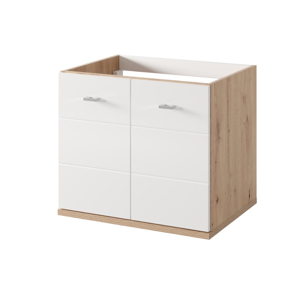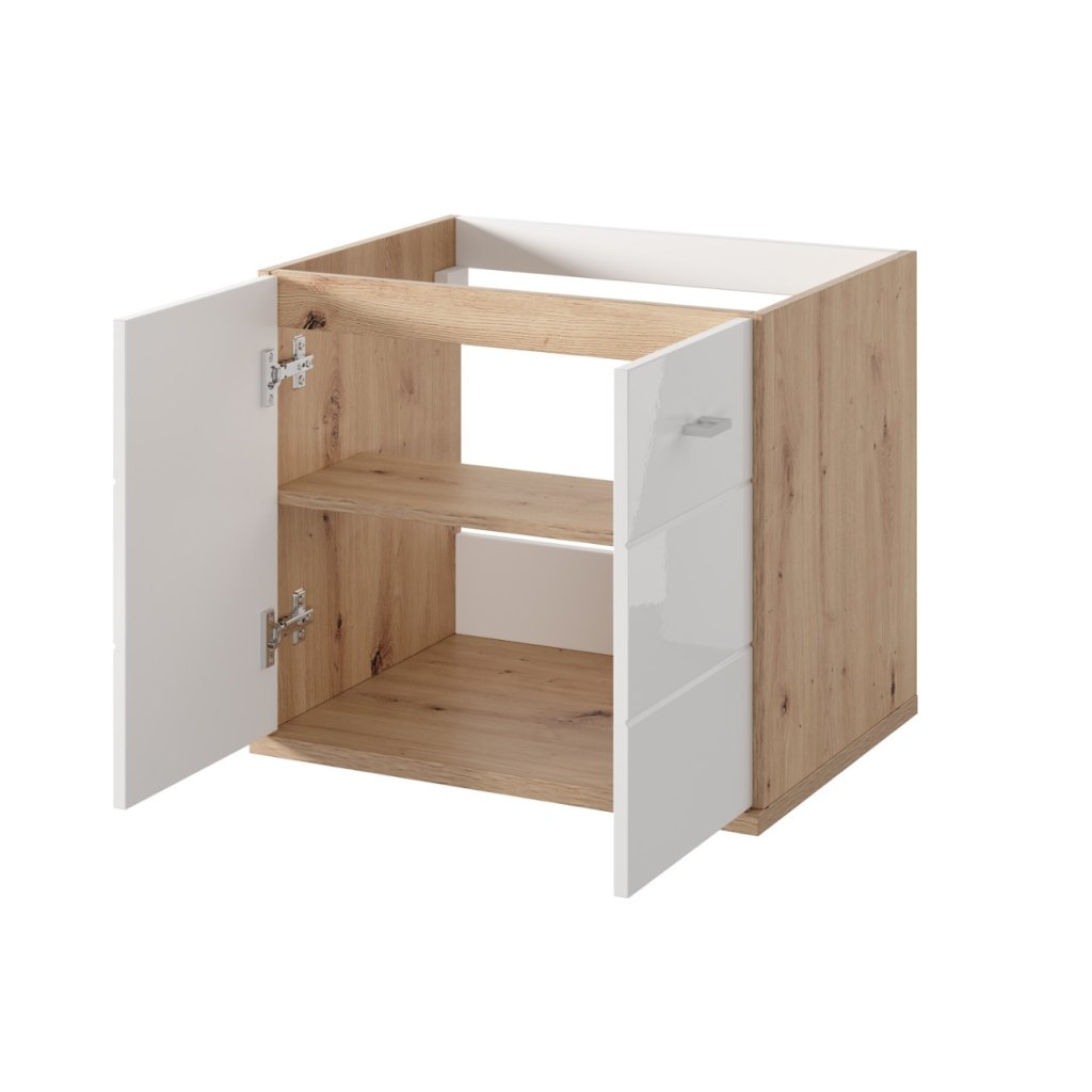 Skrinka pod umývadlo STING 36 | 60 cm spája modernú eleganciu s prirodzeným štýlom. Spojenie bieleho vysokého lesku s dekorom dub artisan prináša do kúpeľne svieži, ľahký a čistý vzhľad. Dizajn dopĺňajú výrazné detaily – chrómové úchytky a precízne frézované čelá, ktoré nábytku dodávajú noblesu a jedinečný charakter. Kolekcia kúpeľňového nábytku STING nie je len estetickým prvkom, ale vnáša do interiéru harmonickú atmosféru ideálnu na relax a pohodu.
