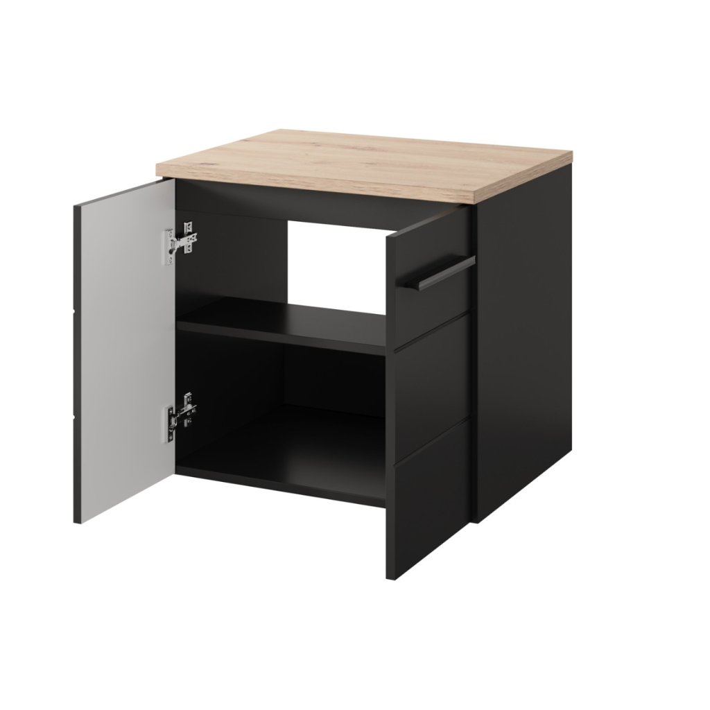 Skrinka pod umývadlo SWING 36 | 60 cm má mimoriadny matný čierny povrch v kombinácii s prírodným dekorom dub zlatý, ktorý dodáva kúpeľni moderný a štýlový vzhľad. Nábytok z kolekcie SWING je ideálnou voľbou pre zákazníkov, ktorí preferujú jemné a vkusné dekory. Ak chcete docieliť vyvážený interiér, odporúčame zostavu zladiť so svetlými obkladmi alebo prírodným kameňom. Skrinka je dvojdverová a vybavená jednou praktickou poličkou. V cene skrinky nie je zahrnutá doska pod umývadlo. V našej ponuke však nájdete dosku pod umývadlo UNI | dub zlatý.
