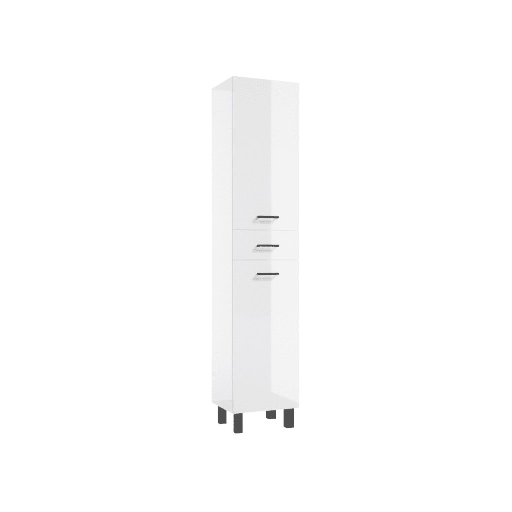Vysoká kúpeľňová skrinka NOVELTY White C35 v modernom bielom lesku prinesie do vašej kúpeľne eleganciu a sviežosť. Lesklá povrchová úprava krásne odráža svetlo a opticky rozjasňuje priestor. Čierne nohy a úchytky vytvárajú atraktívny kontrast, ktorý podčiarkuje moderný dizajn. Skrinka ponúka praktické riešenie v podobe dvoch dvierok, zásuvky a políc, vďaka čomu poskytuje dostatok úložného priestoru. Dvierka je možné namontovať na pravú aj ľavú stranu podľa potreby. Doprajte svojej kúpeľni dotyk luxusu, ktorý si zaslúži.