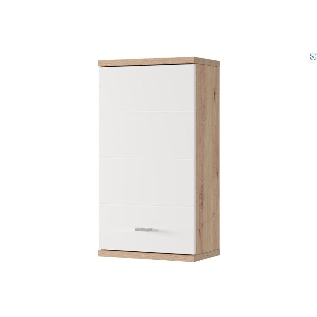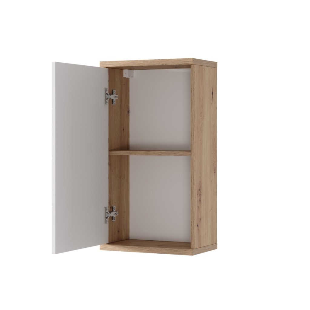 Závesná skrinka do kúpeľne STING 71 spája modernú eleganciu s prirodzeným štýlom. Spojenie bieleho vysokého lesku a dekoru dub artisan prináša svieži, ľahký a čistý vzhľad, ktorý oživí každú kúpeľňu. Dizajn zvýrazňujú chrómové úchytky a precízne frézované čelá, ktoré dodávajú nábytku noblesu a jedinečný charakter. Kolekcia kúpeľňového nábytku STING nie je len o vzhľade – prináša do interiéru harmonickú atmosféru ideálnu na relax a pohodu. Model STING 71 je závesná skrinka s jednými dvierkami, za ktorými sa nachádza praktická polica na uskladnenie kúpeľňových potrieb.