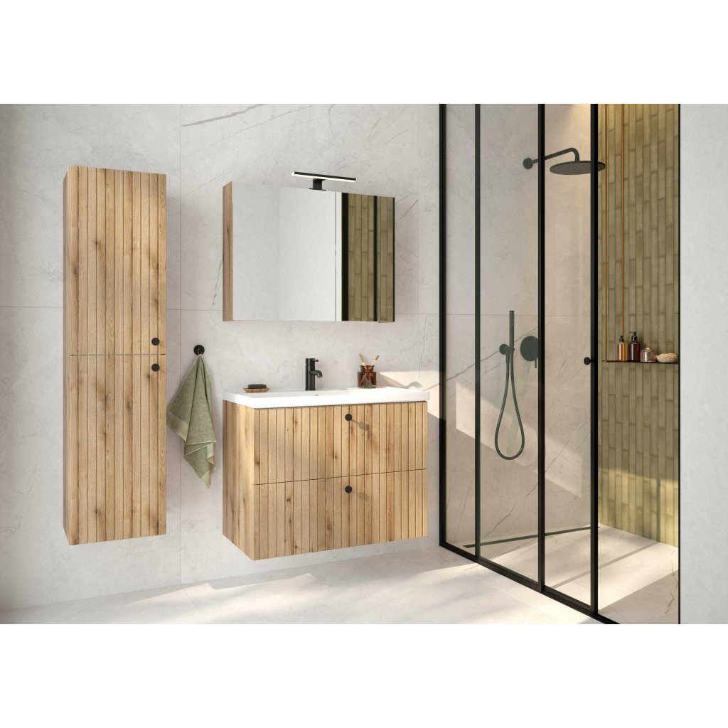 Kúpeľňové skrinky RIETTI OAK EVOKE spájajú odolné materiály, moderný dizajn a praktické detaily. Čierne kovové úchytky podčiarkujú industriálny štýl a zároveň zaručujú pohodlné používanie. Zrkadlová skrinka RIETTI OAK EVOKE E60 je nielen funkčným riešením pre každodenné používanie, ale aj štýlovým doplnkom, ktorý sa hodí k rôznym typom kúpeľňového nábytku a jednoducho sa kombinuje s ostatnými kúpeľňovými prvkami.