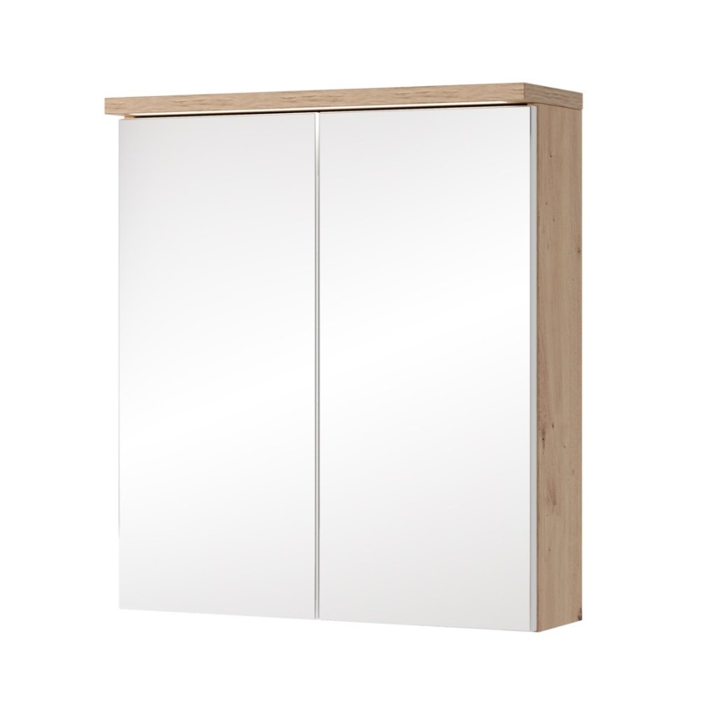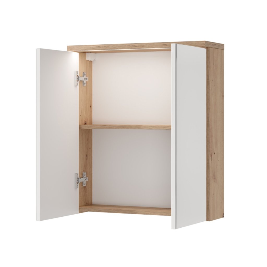 Zrkadlová skrinka STING 56 | 60 cm spája modernú eleganciu s prirodzeným štýlom. Kombinácia bieleho vysokého lesku a dekoru dub artisan prináša do kúpeľne sviežosť, čistotu a ľahkosť. Dizajn dotvárajú chrómové úchytky a precízne frézované čelá, ktoré nábytku dodávajú noblesu a jedinečný charakter. Kolekcia kúpeľňového nábytku STING nie je iba estetickým doplnkom – prináša do interiéru harmonickú atmosféru, ideálnu na relax a príjemné chvíle. Model STING 56 je dvojdverová zrkadlová skrinka vybavená praktickou policou a integrovaným osvetlením, vďaka čomu spája funkčnosť s elegantným dizajnom.