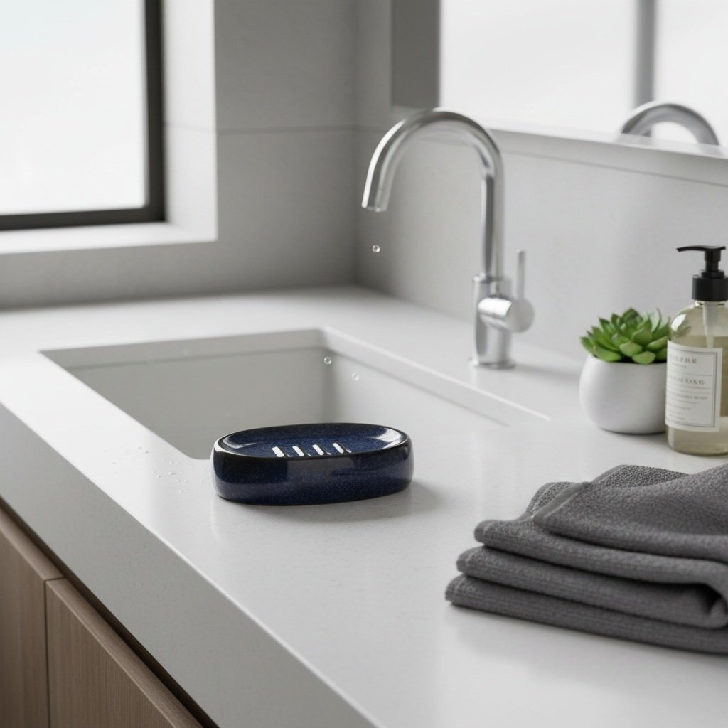 Mydelnička FRIKI | AWD02191922 v elegantnom námornícky modrom odtieni dodá vašej kúpeľni štýlový a moderný vzhľad. Jej originálny škvrnitý dizajn prináša jedinečný vizuálny prvok, ktorý oživí každý interiér. Vďaka svojmu univerzálnemu spracovaniu predstavuje ideálne spojenie praktickosti a estetickej elegancie.