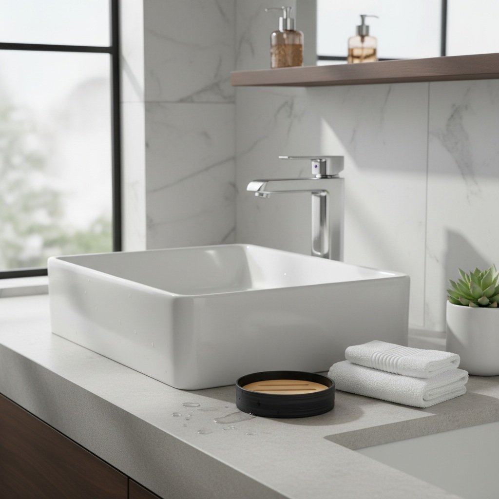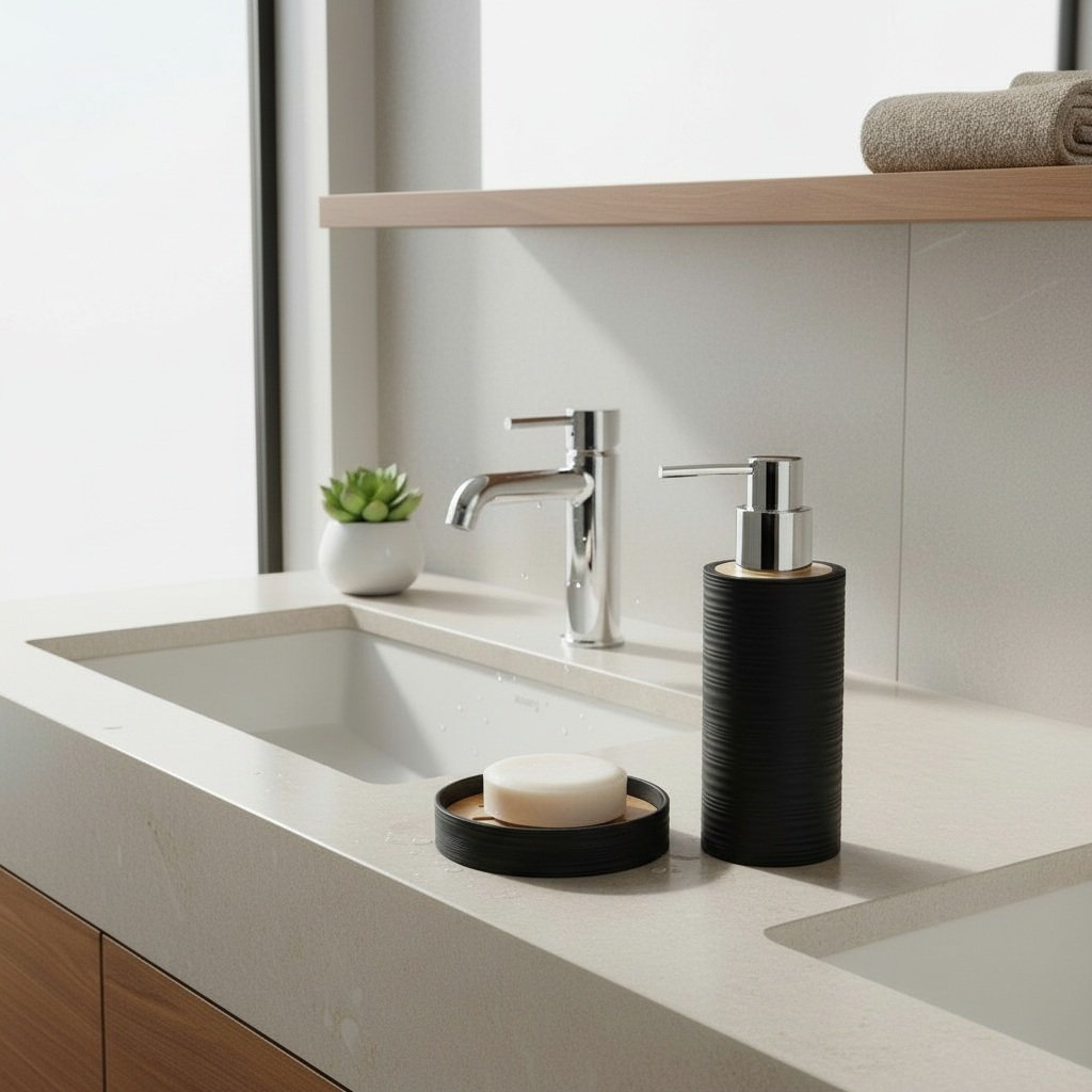 Kvalitné plastové kúpeľňové doplnky sú čoraz populárnejšou voľbou pre moderné kúpeľne, a to nielen vďaka svojej odolnosti, ale aj praktickosti a ľahkej údržbe. Mydelnička KSANTI v elegantnej čiernej farbe prináša do kúpeľne nádych štýlu a sofistikovanosti, pričom zachováva maximálnu funkčnosť. K mydelničke je možné doplniť aj ďalšie kúpeľňové doplnky zo série, ako dávkovač, pohár na kefky či WC kefu, čo vám umožní vytvoriť harmonický a jednotný set. Týmto spôsobom môžete celú kúpeľňu farebne zladiť s vaším textilom, doplnkami alebo obkladmi a dosiahnuť tak dokonale premyslený a esteticky príjemný priestor.