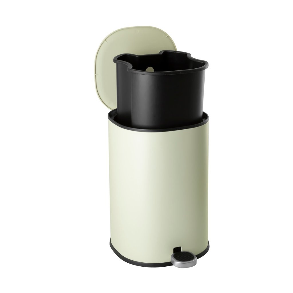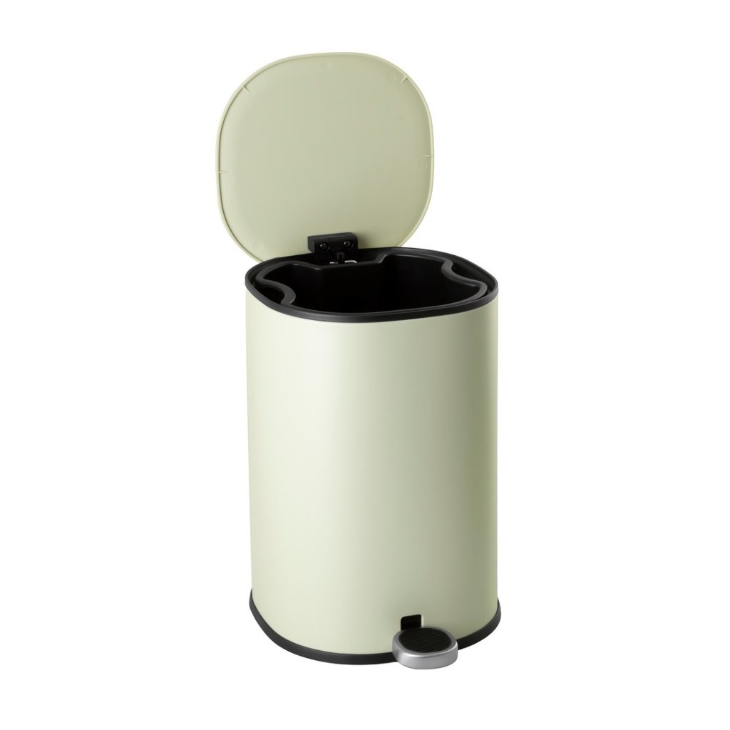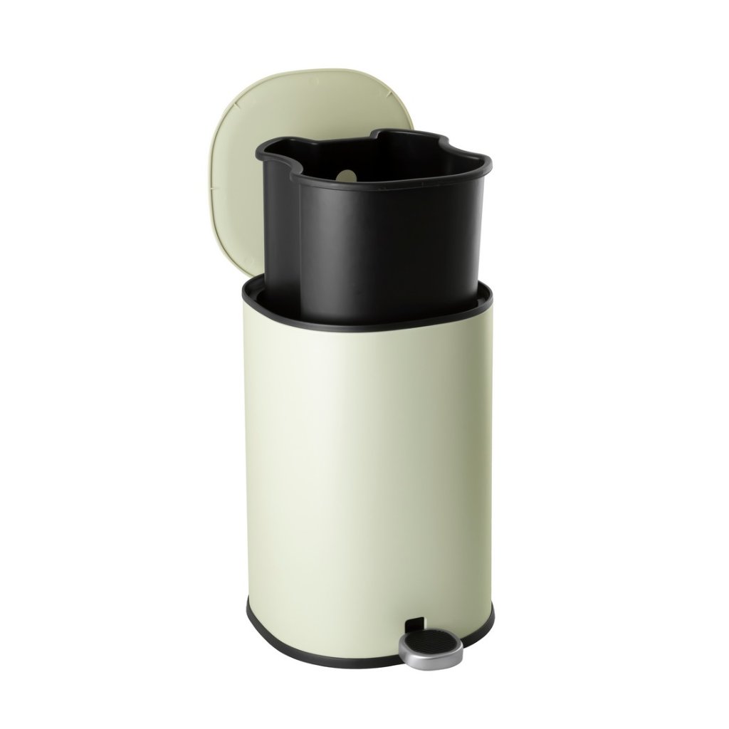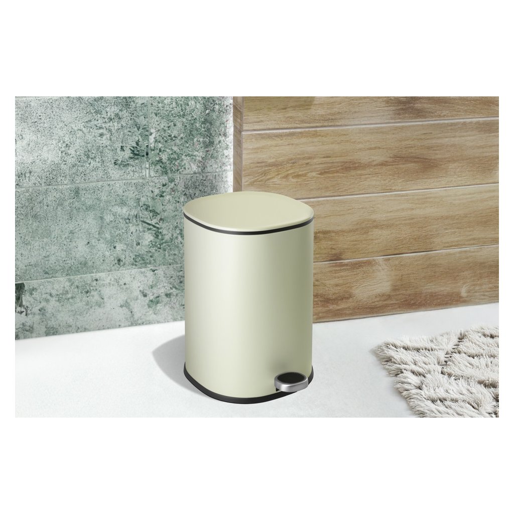 Odpadkový kôš je vyrobený z lakovanej ocele v jemnom, veľmi svetlom olivovom odtieni, čo mu dodáva moderný vzhľad a zároveň zaručuje odolnosť. Systém pomalého zatvárania veka zabezpečuje tichú a pohodlnú manipuláciu. Hygienický pedál umožňuje otváranie bez použitia rúk, zatiaľ čo odnímateľné plastové vnútorné vedro výrazne uľahčuje vyprázdňovanie a čistenie. Zadná rukoväť umožňuje jednoduché prenášanie koša a praktická funkcia aretácie veka vo zvislej polohe zjednodušuje jeho vyprázdňovanie.