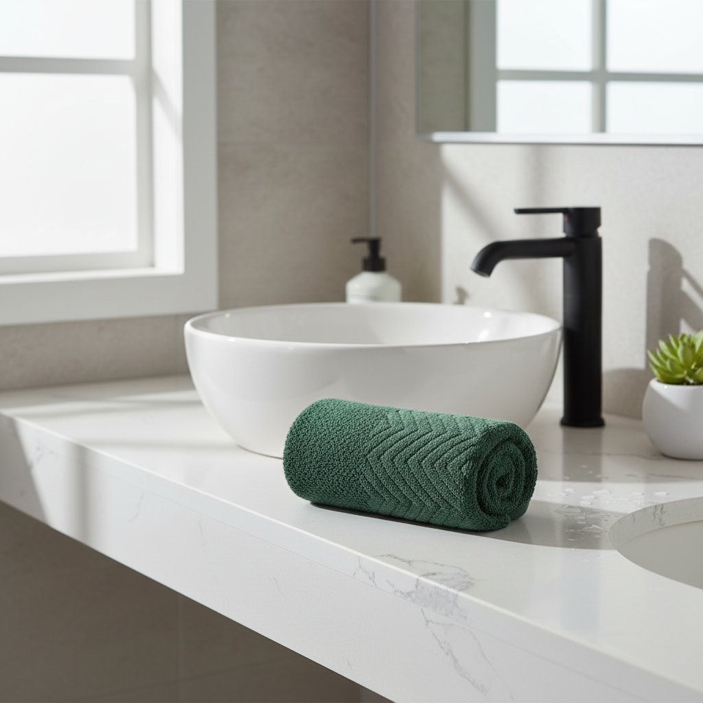 Elegantný uterák z jemného a vysoko savého froté v nádhernom zelenom odtieni prinesie do vašej kúpeľne sviežosť a štýl. Jemný zamatový lem na okrajoch dodáva uteráku vkusný a elegantný vzhľad. Je odolný, ľahký, príjemný na dotyk a vďaka jednoduchému praniu aj mimoriadne praktický na každodenné používanie.