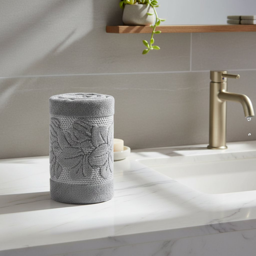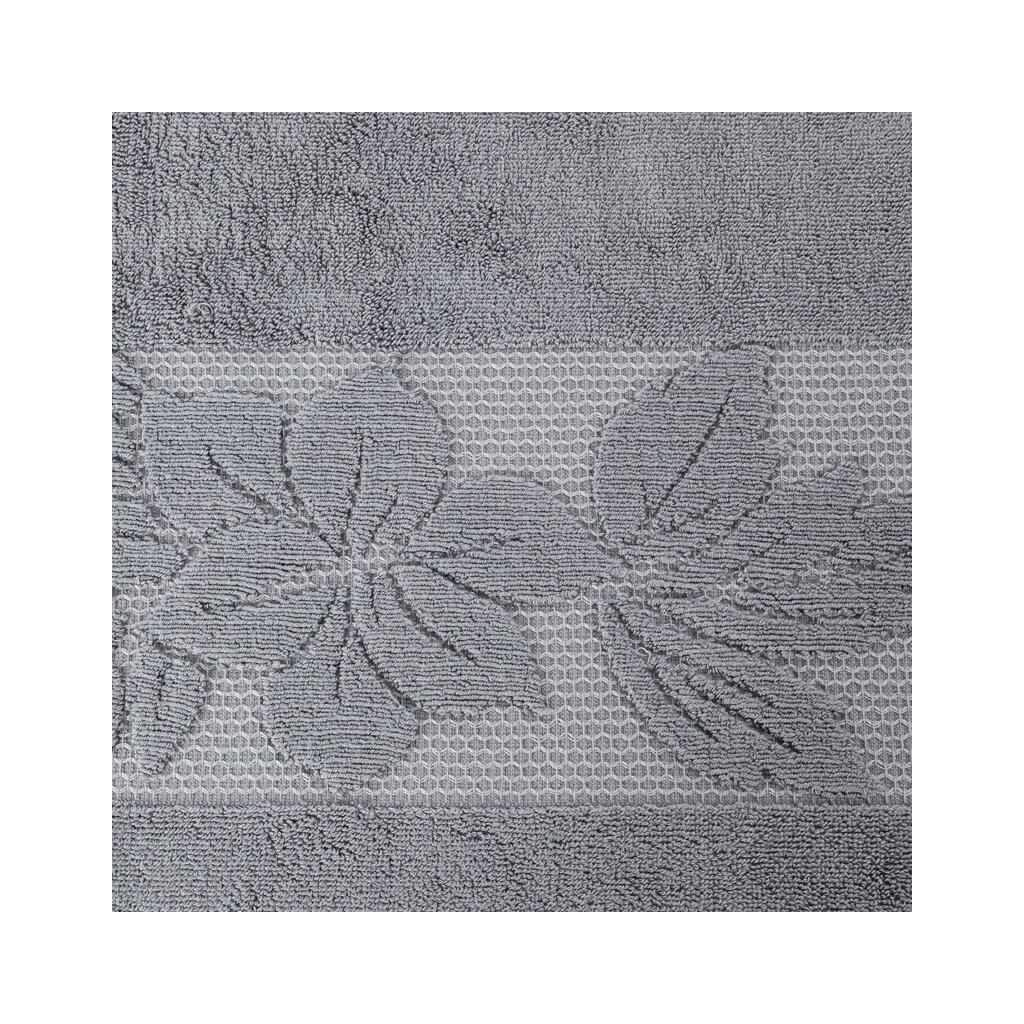 Uterák s dekoratívnym kvetinovým lemom v štýlovom oceľovom odtieni pôsobí elegantne a moderne. Vďaka praktickému rozmeru a jemnému materiálu príjemnému na dotyk je uterák neoddeliteľnou súčasťou každej domácnosti.