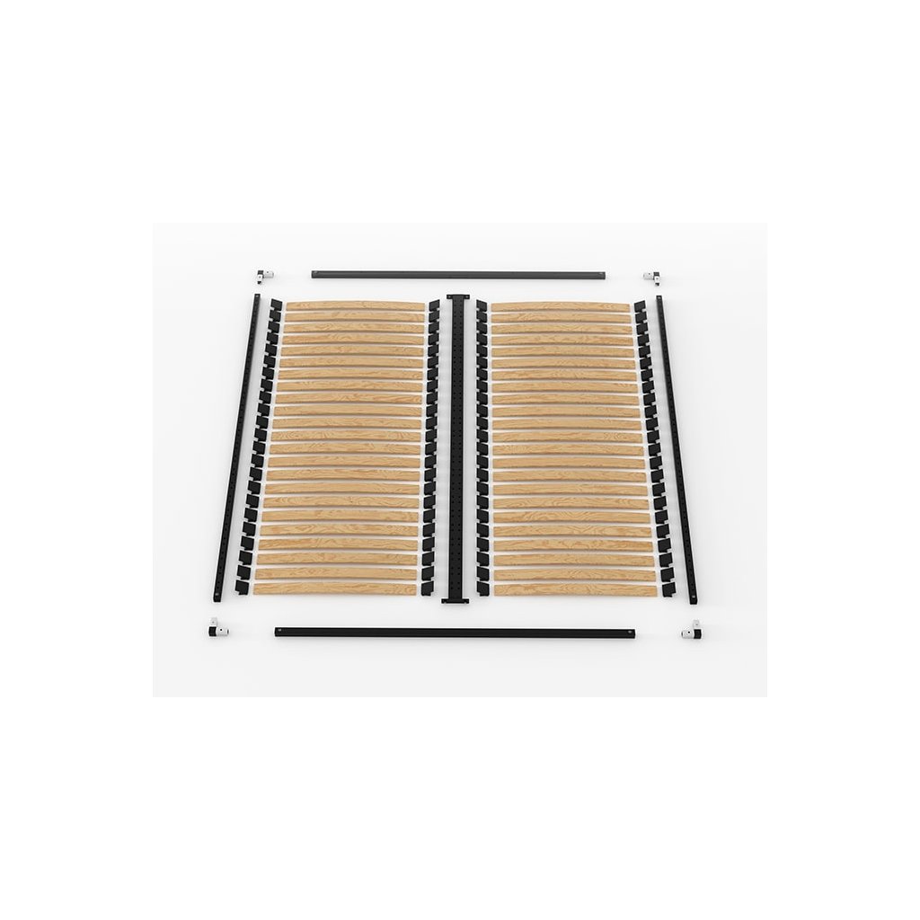 Kovový rám roštu je z pevného kovového profilu lakovaného na čierno. Lak vytvára ochrannú vrstvu proti korózii, predlžuje životnosť konštrukcie a zároveň pôsobí esteticky čisto a moderne. Nosný systém tvoria brezové lamely — brezové drevo je pružné, pevné a pri záťaži sa neštiepi. Vďaka prirodzenej elasticite sa lamely prispôsobujú tlaku tela a zlepšujú komfort spánku aj životnosť matraca. Konce lamiel sú uložené v plastových koncovkách, ktoré tlmia vibrácie a nárazy, zabraňujú vŕzganiu a fixujú lamely v správnej polohe bez poškodenia dreva či rámu.