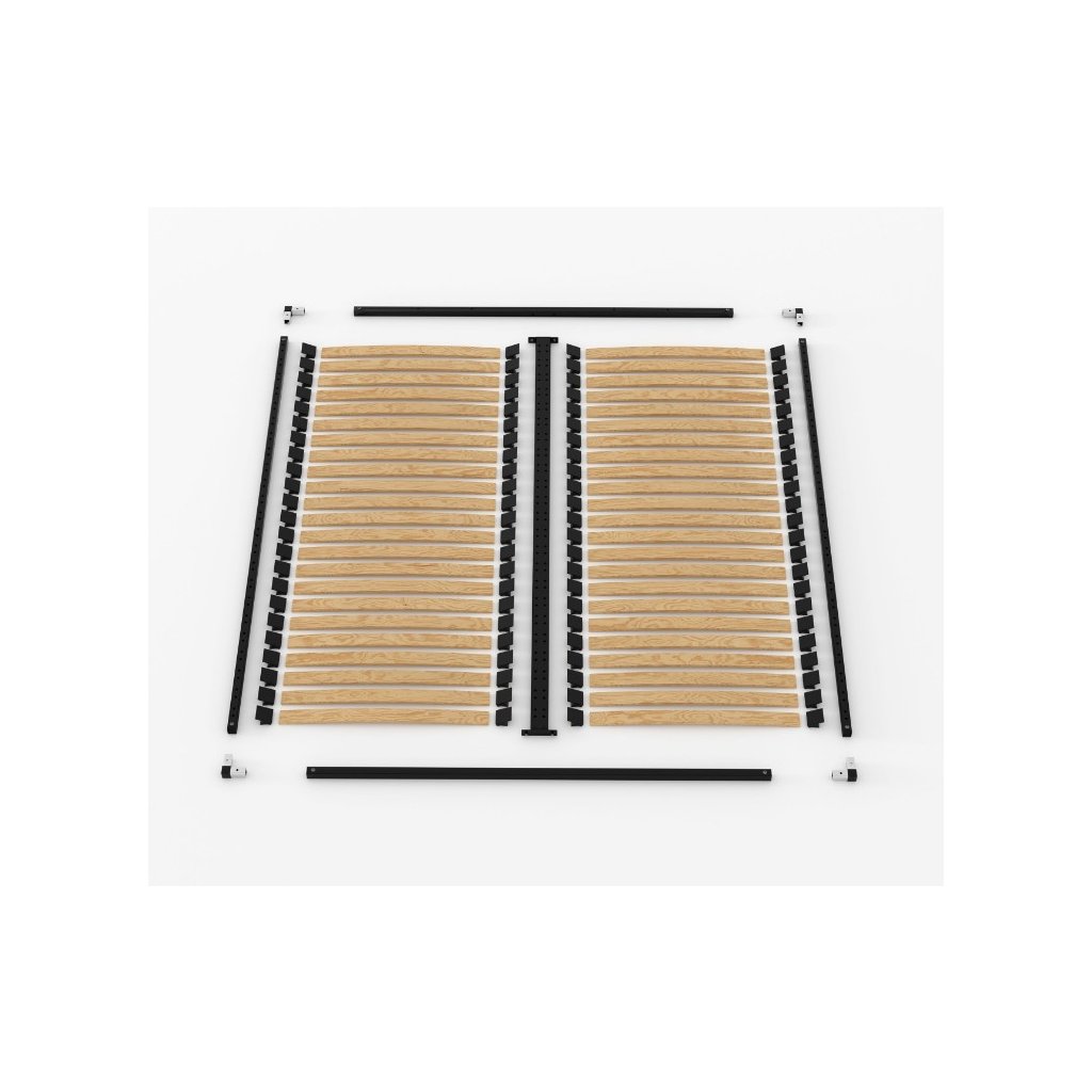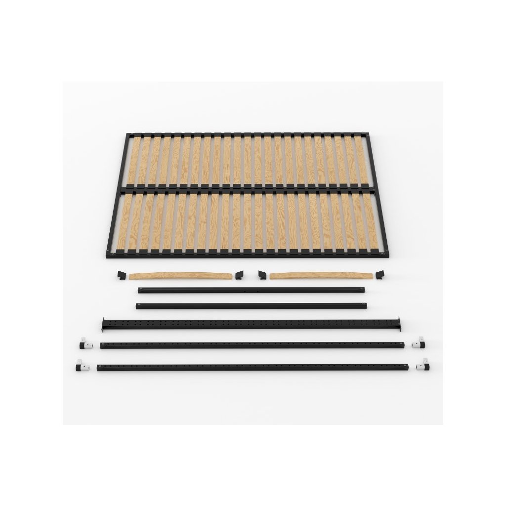 Kovový rám roštu je z pevného kovového profilu lakovaného na čierno. Lak vytvára ochrannú vrstvu proti korózii, predlžuje životnosť konštrukcie a zároveň pôsobí esteticky čisto a moderne. Nosný systém tvoria brezové lamely — brezové drevo je pružné, pevné a pri záťaži sa neštiepi. Vďaka prirodzenej elasticite sa lamely prispôsobujú tlaku tela a zlepšujú komfort spánku aj životnosť matraca. Konce lamiel sú uložené v plastových koncovkách, ktoré tlmia vibrácie a nárazy, zabraňujú vŕzganiu a fixujú lamely v správnej polohe bez poškodenia dreva či rámu.