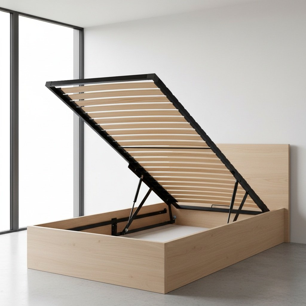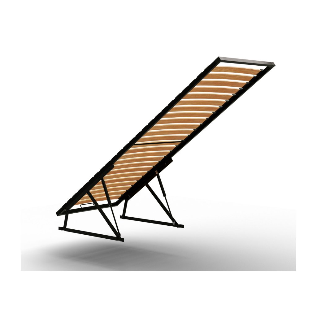 Výklopný lamelový rošt SMP 90 je určený do postelí s úložným priestorom. Je vyrobený z pevného kovového rámu lakovaného na čierno a obsahuje 24 brezových lamiel so šírkou 53 mm. Lamely sú uložené v pohyblivých plastových koncovkách, ktoré zabezpečujú pevnú oporu pre matrac a zároveň tlmia nárazy pri používaní. Kovový rám má profil 20 × 30 × 2 a rošt sa dodáva už zmontovaný v celku. Montážne skrutky nie sú priložené, pretože vhodný typ závisí od materiálu a hrúbky postele. Pri objednávke odporúčame uviesť hmotnosť matraca – podľa nej je možné dodať plynové pružiny so zodpovedajúcou silou. Pri ľahšom matraci môže rošt nedoliehať, pri ťažšom bude manipulácia pri zdvíhaní náročnejšia. V štandarde sú súčasťou balenia univerzálne plynové pružiny.