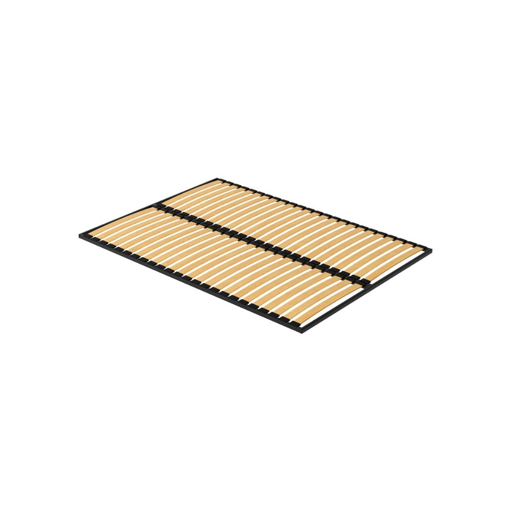 Kovový rošt SMS 140 je vyrobený z pevnej oceľovej konštrukcie s čiernym lakovaním. Tvoria ho dva rady po 24 brezových lamiel so šírkou 53 mm, ktoré sú uložené v plastových koncovkách — tie zabezpečujú pevnú oporu matraca a zároveň tlmia nárazy pri používaní. Kovový rám má profil 20 × 30 × 2 a rošt sa dodáva už zmontovaný, pripravený na okamžité použitie.