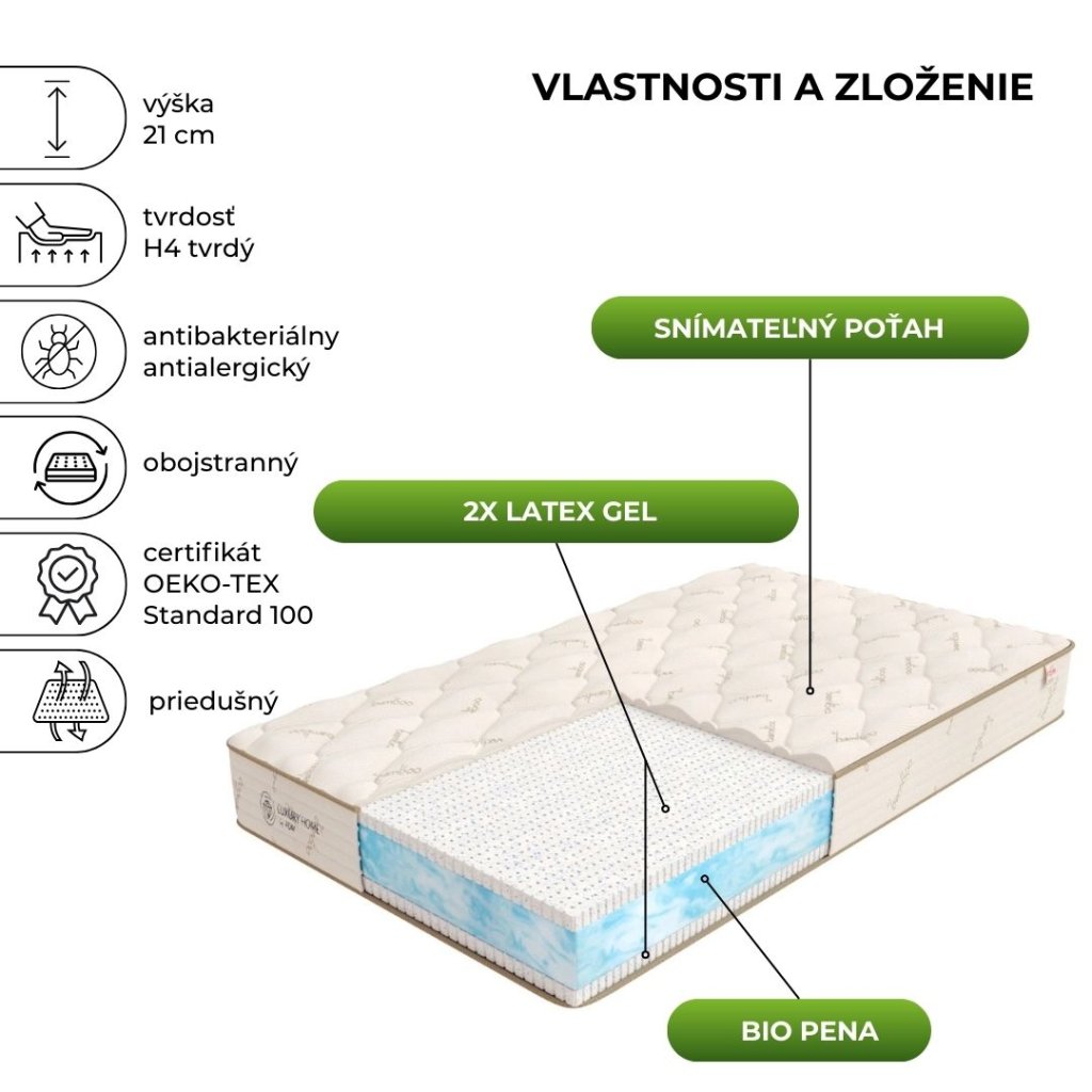 Objavte ideálnu harmóniu prírodných materiálov a modernej technológie, ktorá sa postará o zdravý a nerušený spánok. Matrac MARETTO z bio peny a latex gélu je navrhnutý tak, aby poskytoval maximálne pohodlie, optimálnu oporu a výnimočný komfort počas celej noci. Jeho tvrdosť H4 zaručuje stredne tvrdý pocit ležania, pričom si matrac zachováva pružnosť a vysokú odolnosť voči deformácii. Kvalitu výrobku potvrdzuje certifikát OEKO-TEX®, ktorý garantuje bezpečné a zdravotne nezávadné materiály.