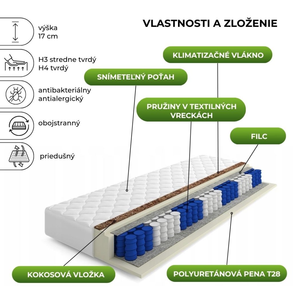 Každá taštičková pružina je uložená v samostatnom vrecku, čo zaručuje tichý chod, nezávislý pohyb pružín a presné prispôsobenie sa tvaru tela. Kokosová vrstva je prírodný materiál, ktorý zvyšuje tvrdosť, priedušnosť a hygienu matraca, čím prispieva k zdravému a pohodlnému spánku. Matrac je určený na obojstranné používanie, čo predlžuje jeho životnosť a umožňuje zvoliť si preferovanú tvrdosť strany. Vďaka vysokej cirkulácii vzduchu matrac zabraňuje tvorbe plesní a hromadeniu vlhkosti, čím ostáva svieži a čistý. Poťah so zipsom je snímateľný a prateľný v práčke, takže údržba matraca je jednoduchá a hygienická.