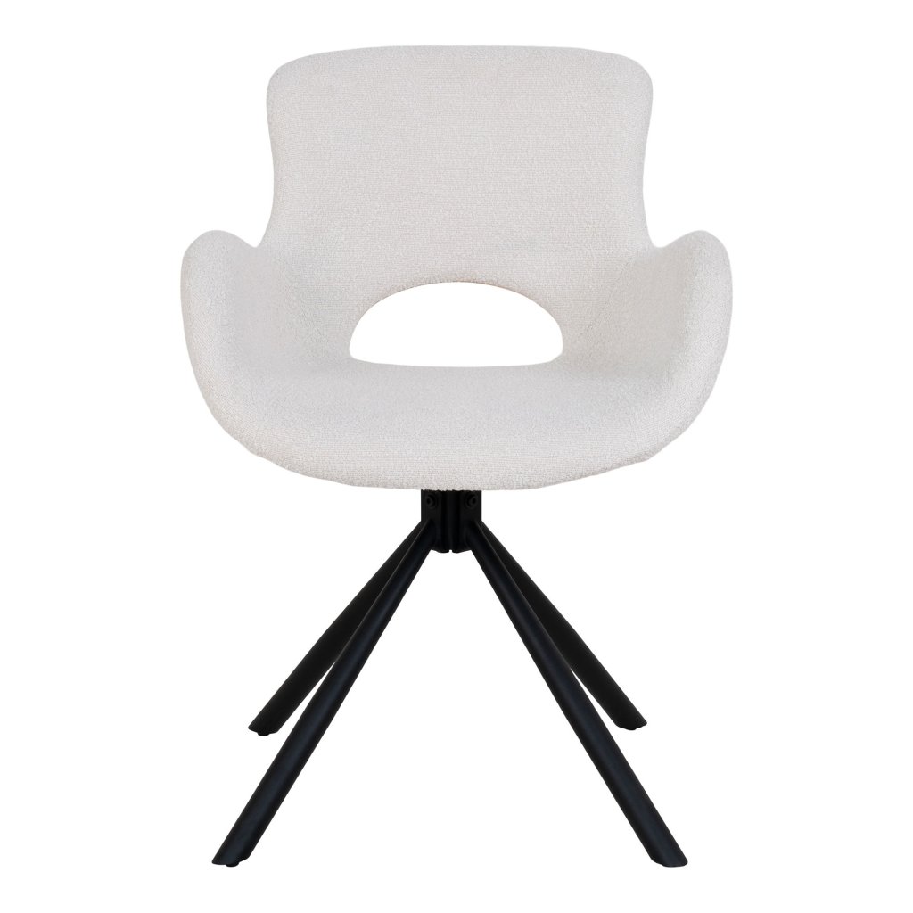 Jedálenská stolička AMORIN v príjemnom prevedení sivobiela s kombináciou čiernych nôh je otočná o 360 °C. Elegantne tvarovaný sedák a opierka chrbta plynule prechádzajú do pohodlných podrúčok, ktoré zaisťujú dokonalé pohodlie pri sedení. Štýlový otvor v zadnej časti dodáva stoličke ľahkosť a vizuálnu zaujímavosť. Celkový vzhľad jedálenskej stoličky dotvára mäkký poťah z bielej látky bouclé, ktorá pôsobí útulne a zároveň luxusne.
