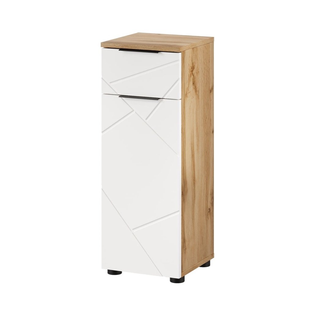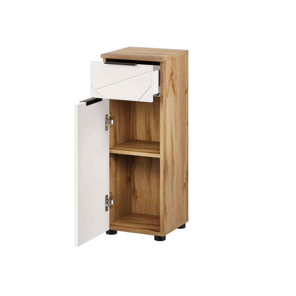 Inšpirujte sa kúpeľňovou kolekciou MAZI, ktorá zaujme jedinečnou farebnosťou a štýlovým dizajnom. Nábytok MAZI dokonale spája estetiku s praktickosťou, vďaka čomu je vhodný aj do menších kúpeľní. Kolekcia je dostupná v elegantnej kombinácii bielej a dubu Wotan. Nízká skrinka MAZI WHITE 45 | 30 cm ponúka jednu zásuvku a jednu skrinku s policou, pričom doska je súčasťou balenia.