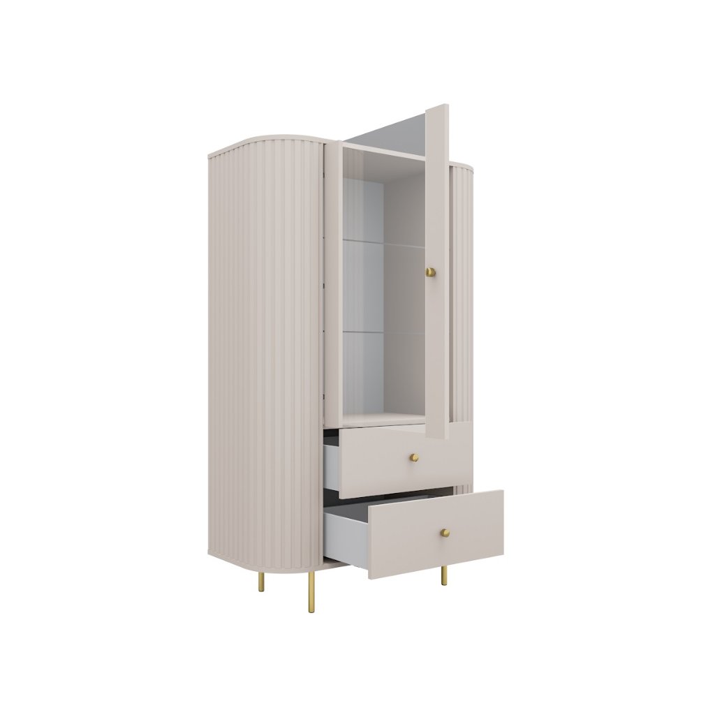 Kolekcia VAOLIA prináša čistý minimalistický štýl, oživený precíznymi frézovanými detailmi, ktoré dodávajú interiéru nový nádych elegancie. Tlmené, zemité odtiene pieskovo béžovej sú doplnené zlatými akcentmi, ktoré jemne kontrastujú so svetlou farebnou paletou a dodávajú nábytku sofistikovaný charakter. Vitrína VAOLIA 1F2S je navrhnutá ako jednodverový model s dvomi priestrannými zásuvkami, ktoré poskytujú praktický úložný priestor. Kovové nohy a úchytky v zlatom prevedení dodávajú vitríne ľahký, vzdušný vzhľad, pričom ju opticky nezaťažujú a podčiarkujú jej modernú eleganciu.