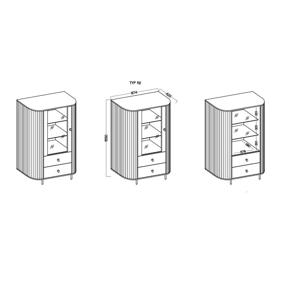 Vitrína VAOLIA je vyrobená z kvalitnej laminovanej dosky v kombinácii s MDF materiálom s hrúbkou 16 mm, čo jej zaručuje vysokú odolnosť, stabilitu a dlhú životnosť. Jej povrchy sú pevné, nenáročné na údržbu a navrhnuté tak, aby odolávali každodennému používaniu. Moderný vzhľad a stabilitu vitríny zvýrazňujú elegantné kovové nohy a úchytky.