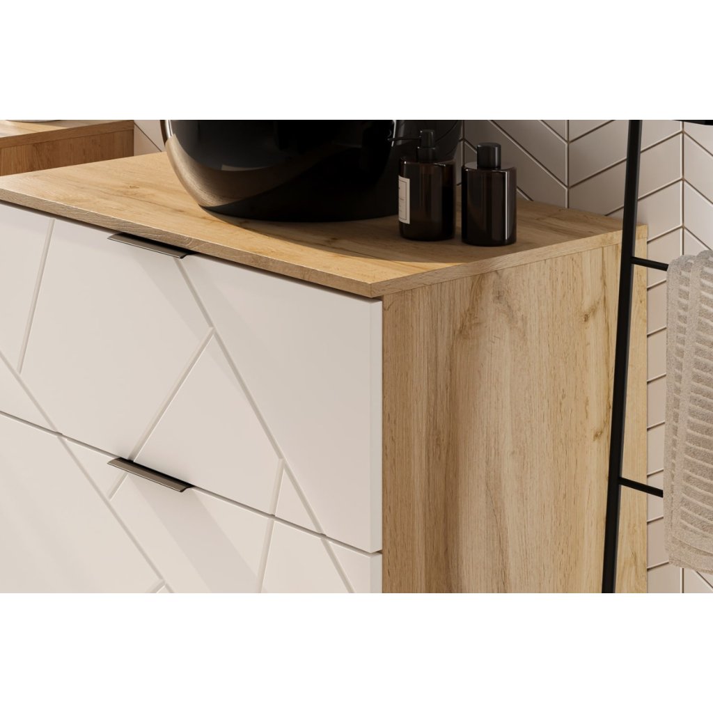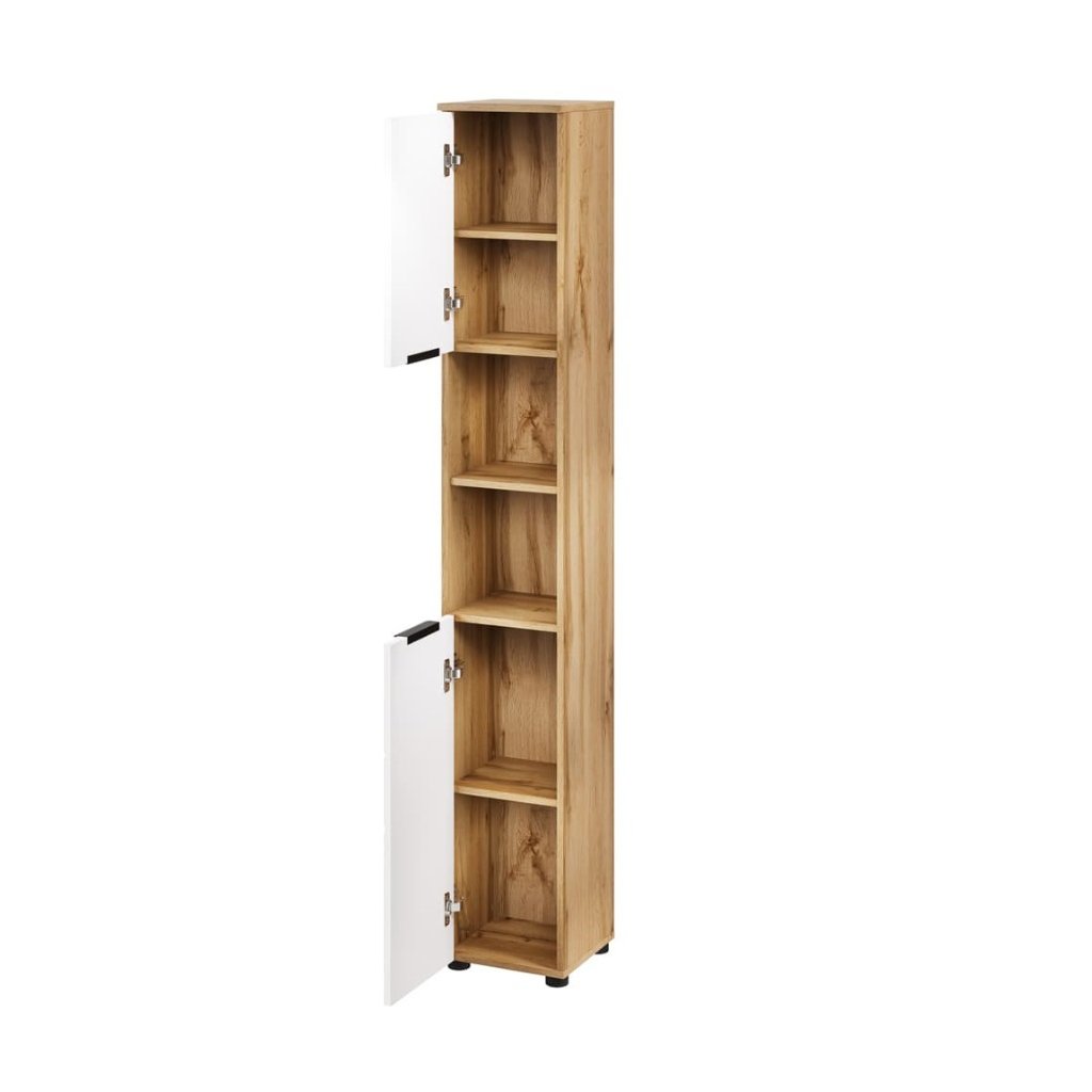 Inšpirujte sa kúpeľňovou kolekciou MAZI, ktorá zaujme jedinečnou farebnosťou a štýlovým dizajnom. Nábytok MAZI dokonale spája estetiku s praktickosťou, vďaka čomu je vhodný aj do menších kúpeľní. Kolekcia je dostupná v elegantnej kombinácii bielej a dubu Wotan. Vysoká skrinka do kúpeľne MAZI WHITE 70 je dvojdverová s policami.