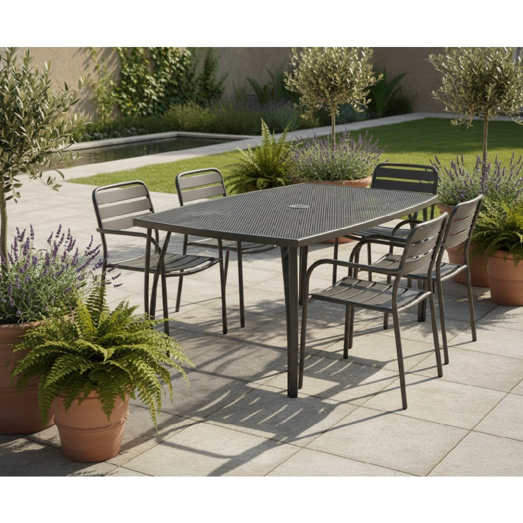 Vneste do svojho exteriéru eleganciu a spoľahnite sa na nadčasový čierny záhradný stôl DIXON. Tento praktický a odolný kúsok je ideálny na terasy, záhrady aj balkóny, kde oceníte jeho funkčnosť a dlhú životnosť. Čierny kovový stôl je skvelou voľbou na rodinné obedy, grilovanie s priateľmi aj pokojné chvíle pri šálke kávy. Vďaka univerzálnemu dizajnu ho jednoducho skombinujete so záhradnými stoličkami rôznych štýlov a materiálov – od textílie cez drevo až po plast.