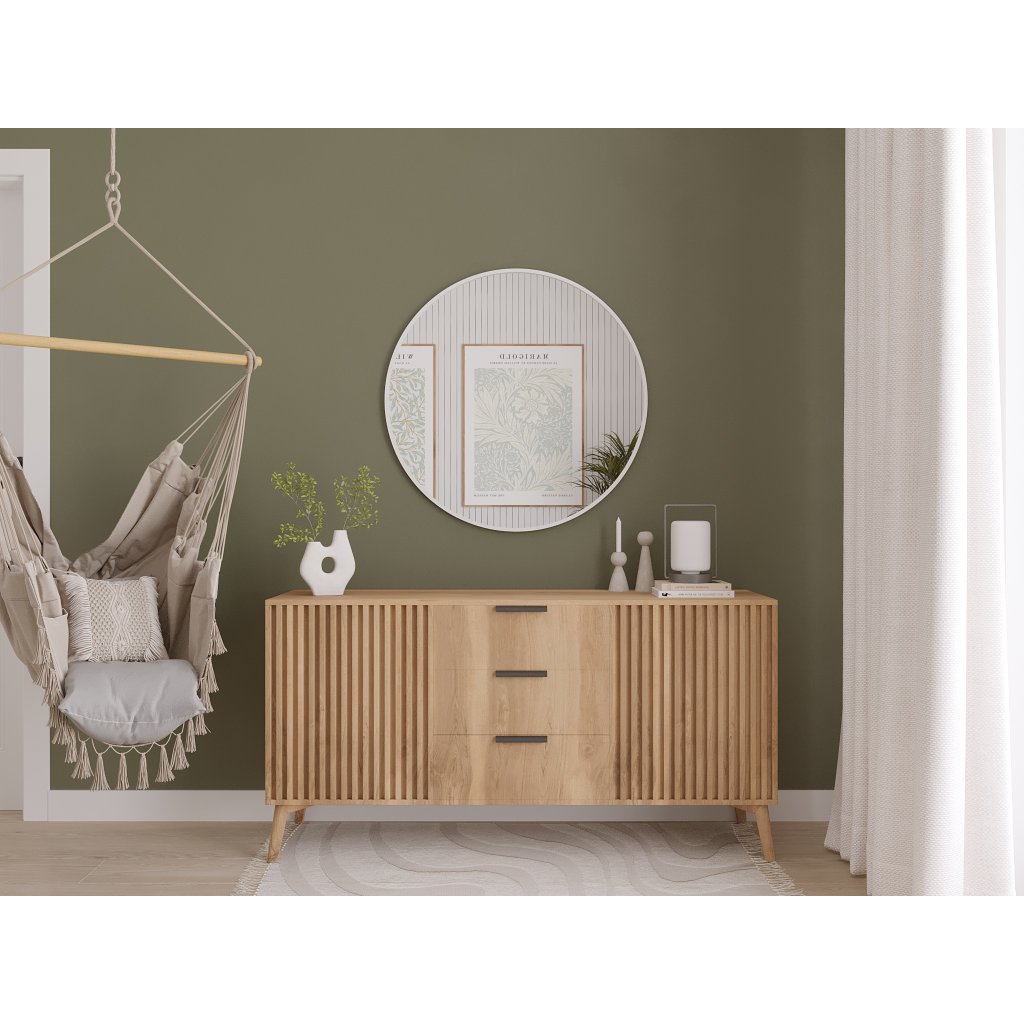 Zrkadlo ELISTUL nie je len štýlovým doplnkom vášho interiéru, ale aj praktickým a elegantným riešením. Spája funkčnosť s estetikou a dokáže vylepšiť každú miestnosť. Jeho jemne biely rám dokonale ladí s okrúhlym tvarom a pomáha opticky zväčšiť priestor. Všestranné využitie zrkadla oceníte v spálni, predsieni aj kúpeľni.