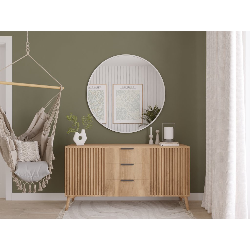 Zrkadlo ELISTUL s priemerom 80 cm nie je len štýlovým doplnkom vášho interiéru, ale aj praktickým a elegantným riešením. Spája funkčnosť s estetikou a dokáže vylepšiť každú miestnosť. Jeho jemne biely rám dokonale ladí s okrúhlym tvarom a pomáha opticky zväčšiť priestor. Všestranné využitie zrkadla oceníte v spálni, predsieni aj kúpeľni.