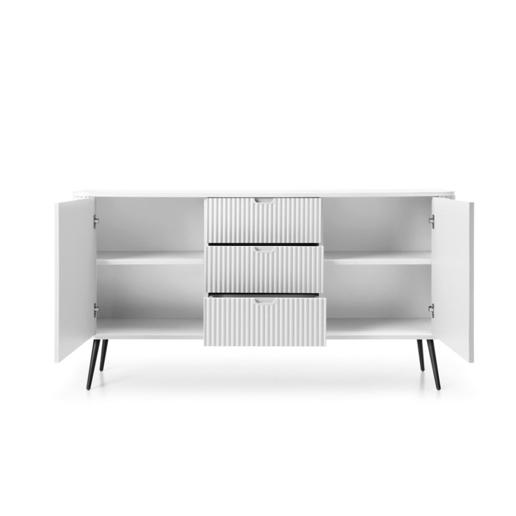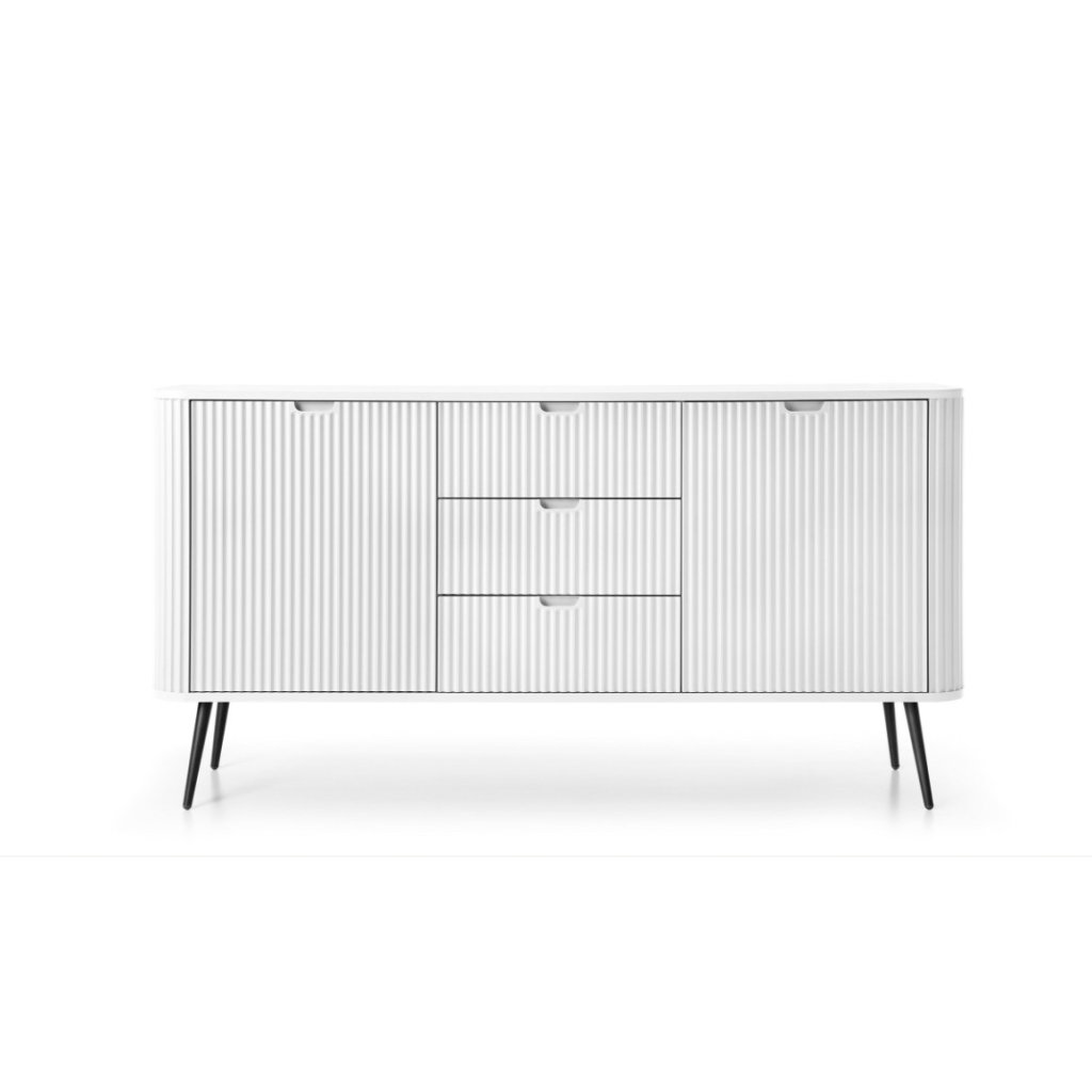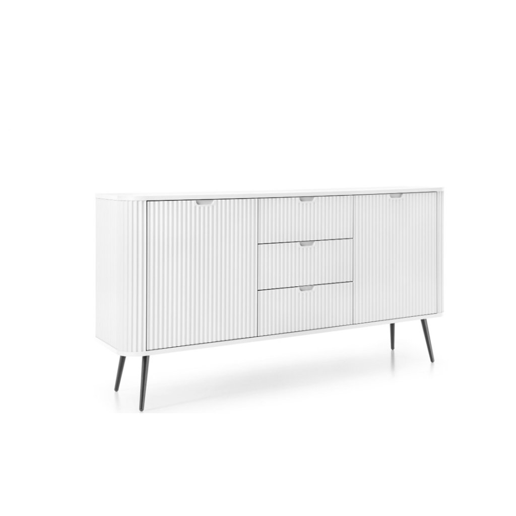 Štýlová komoda ZEVA KSZ-168 v najpredávanejšej bielej farbe s kombináciou čiernych vysokých nôh v matnom prevedení. Komoda kombinuje moderný dizajn s praktickými funkciami, čo ju robí ideálnou voľbou pre každý interiér. Komoda je trojdielna s troma zásuvkami a dvomi dvierkami za, ktorými sú police.