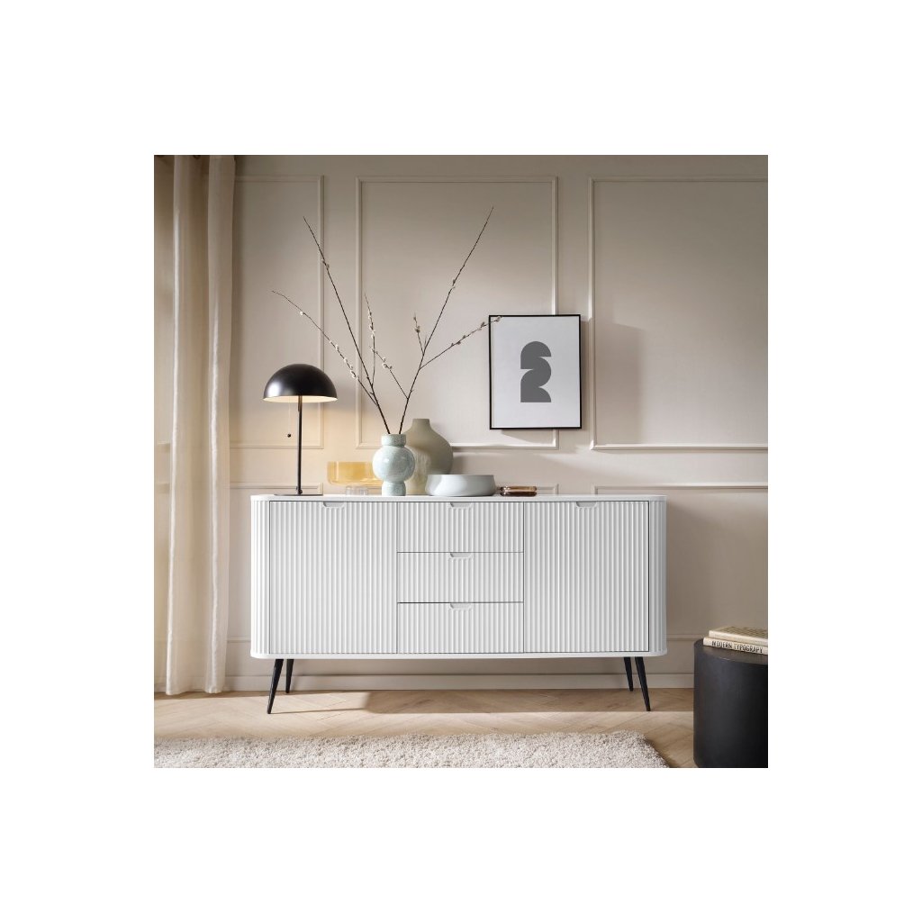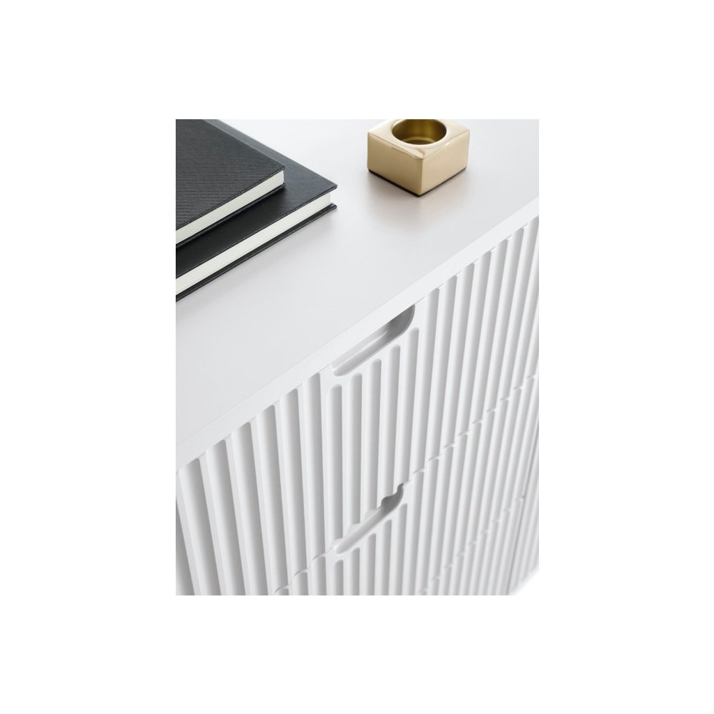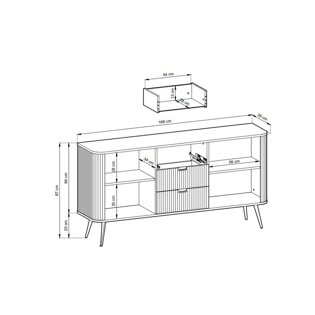 Štýlová komoda ZEVA KSZ-168 v najpredávanejšej bielej farbe s kombináciou čiernych vysokých nôh v matnom prevedení. Komoda kombinuje moderný dizajn s praktickými funkciami, čo ju robí ideálnou voľbou pre každý interiér. Komoda je trojdielna s troma zásuvkami a dvomi dvierkami za, ktorými sú police.