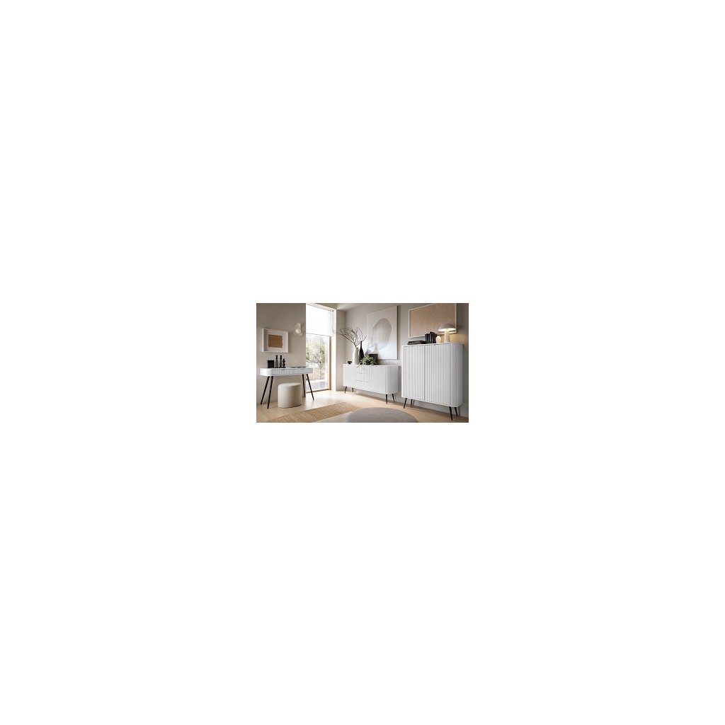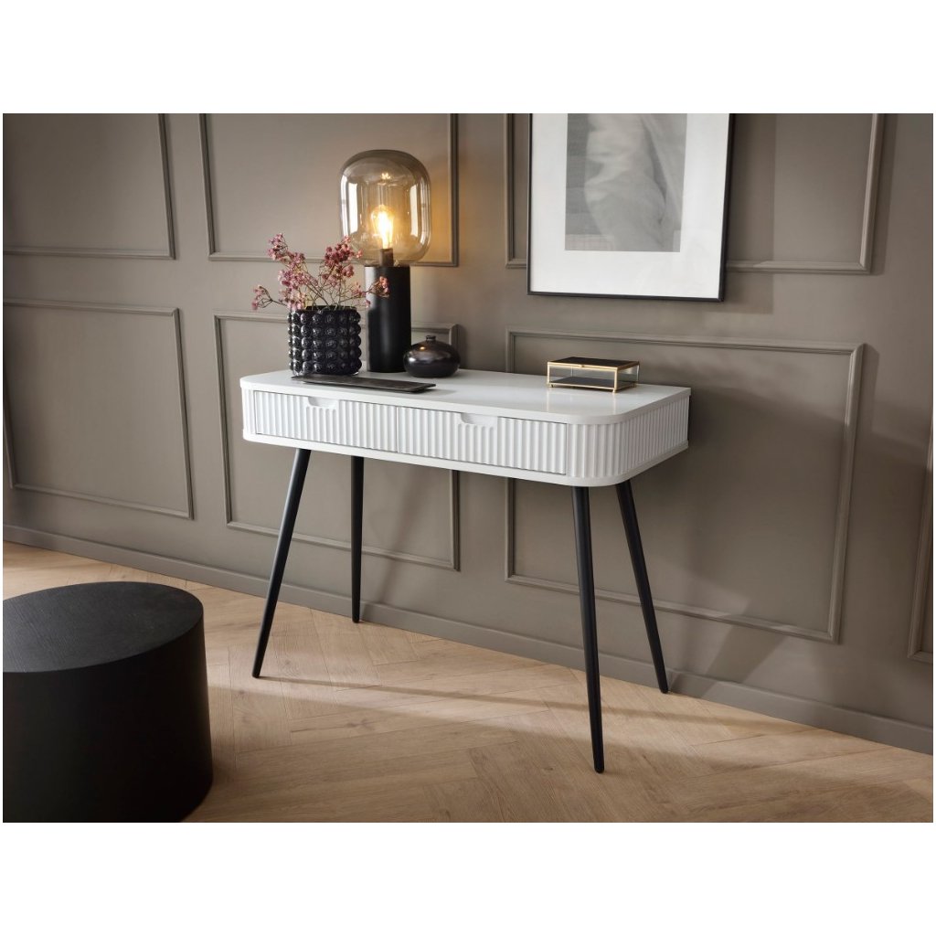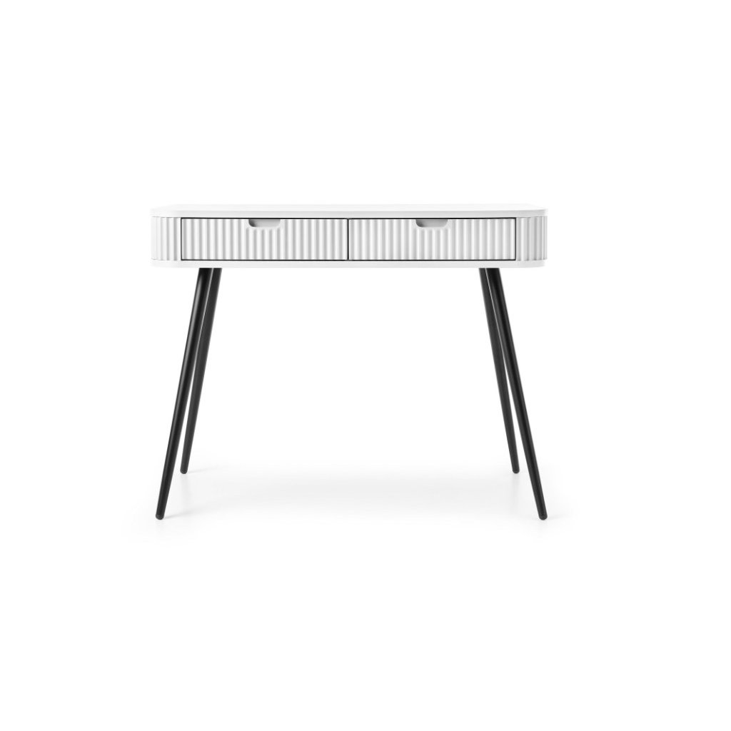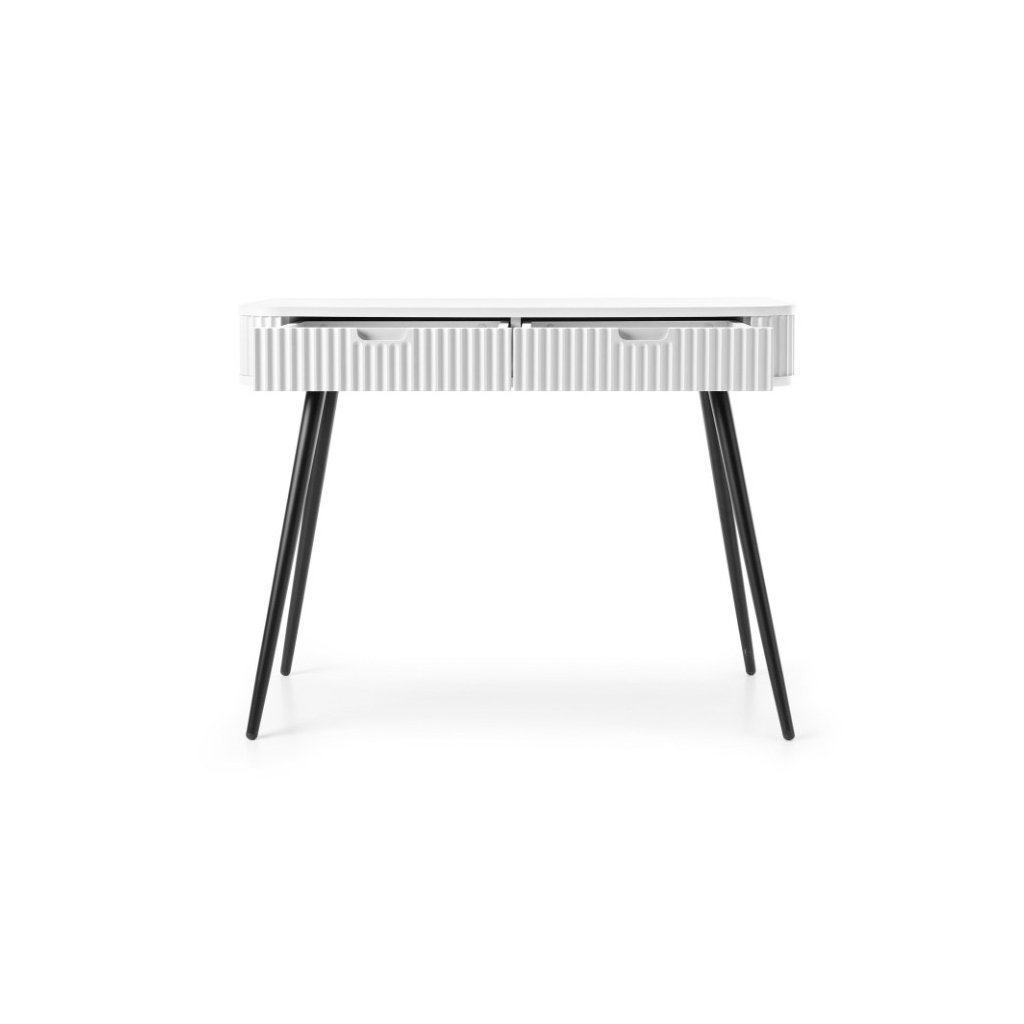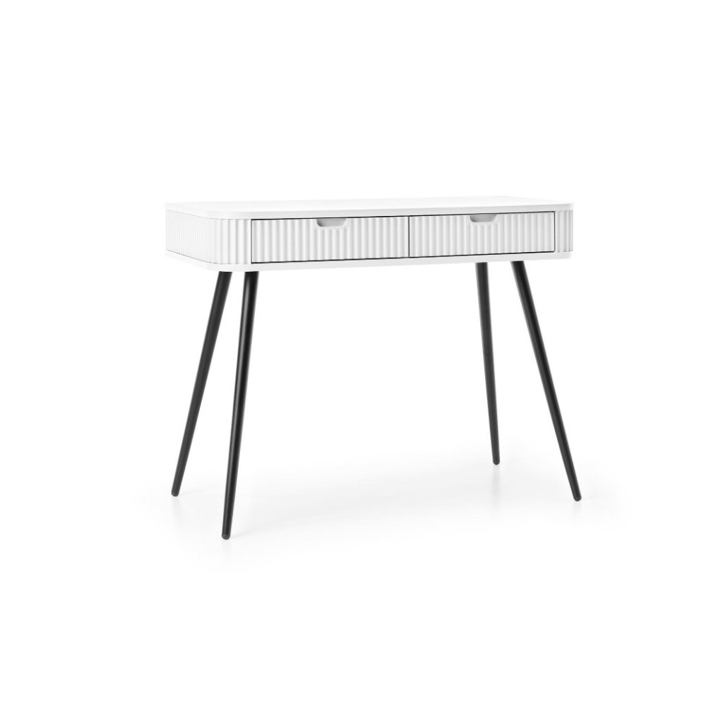 Praktický toaletný stolík ZEVA T-103 v najpredávanejšej bielej farbe s kombináciou čiernych vysokých nôh v matnom prevedení. Toaletný stolík kombinuje moderný dizajn s praktickými funkciami, čo ju robí ideálnou voľbou pre každý interiér. Toaletný stolík má dve priestranné zásuvky.