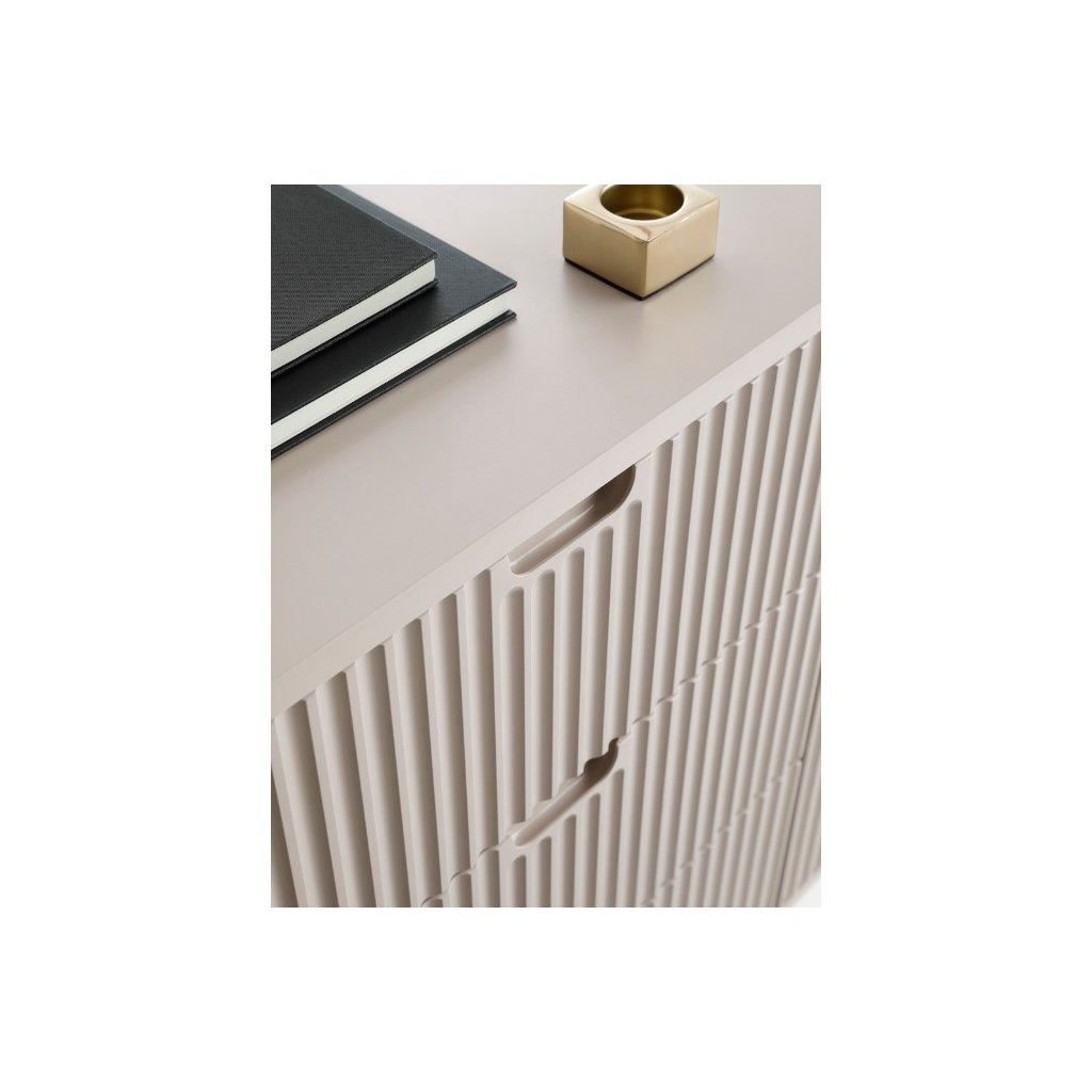 Toaletný stolík ZEVA je vyrobený z kvalitného laminátu s ABS hranami, čo zaručuje jej dlhú životnosť a odolnosť voči poškodeniu. Nohy sú kovové, pevné a stabilné. Úchytky sú integrované frézované priamo v predných čelách, čo zvyšuje estetickú čistotu a eleganciu dizajnu.