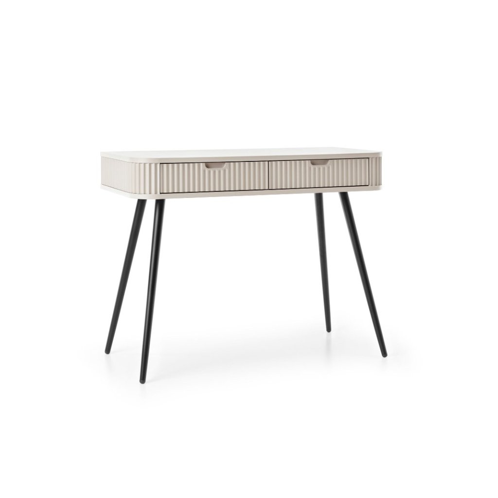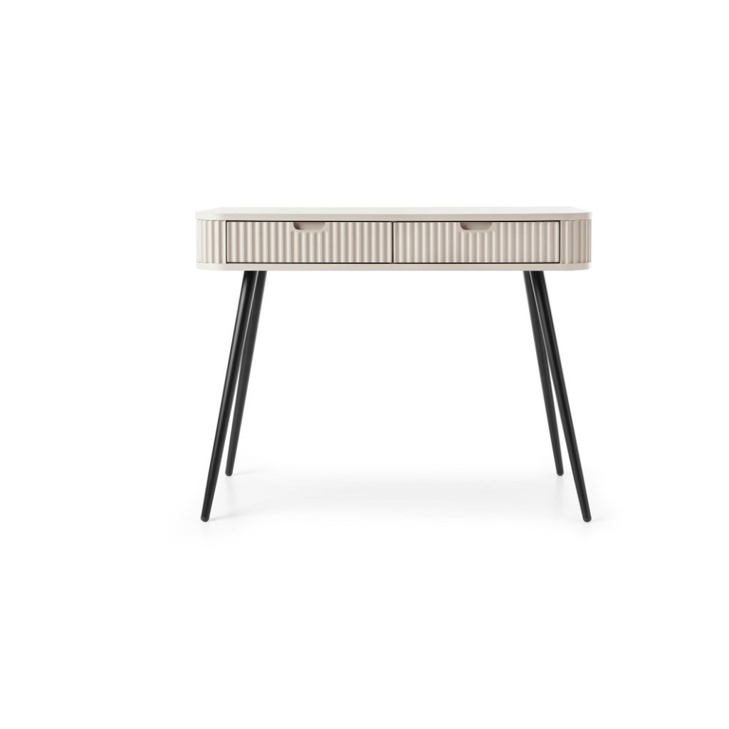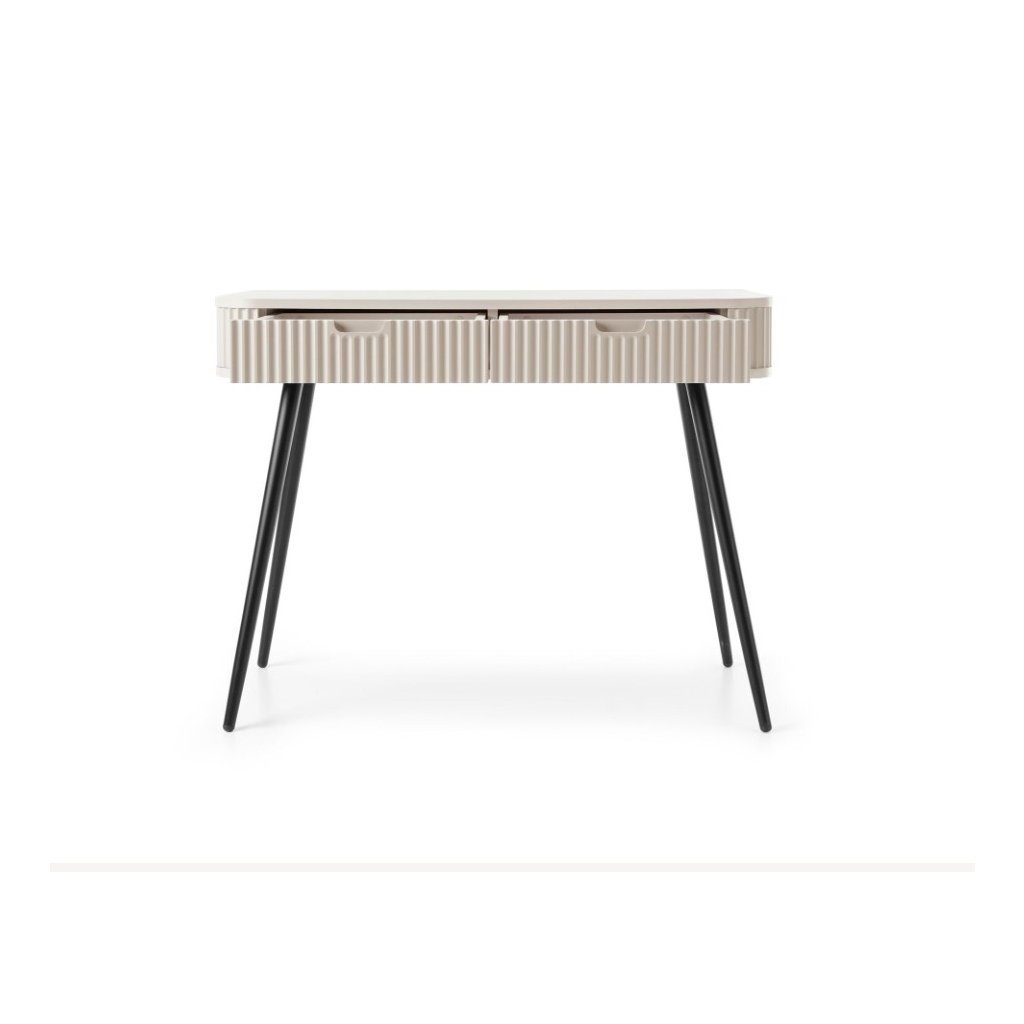 Praktický toaletný stolík ZEVA T-103 v populárnej cashmere farbe s kombináciou čiernych vysokých nôh v matnom prevedení. Toaletný stolík kombinuje moderný dizajn s praktickými funkciami, čo ju robí ideálnou voľbou pre každý interiér. Toaletný stolík má dve priestranné zásuvky. Nechajte sa inšpirovať našou novou ponukou a vytvorte si príjemný domov.