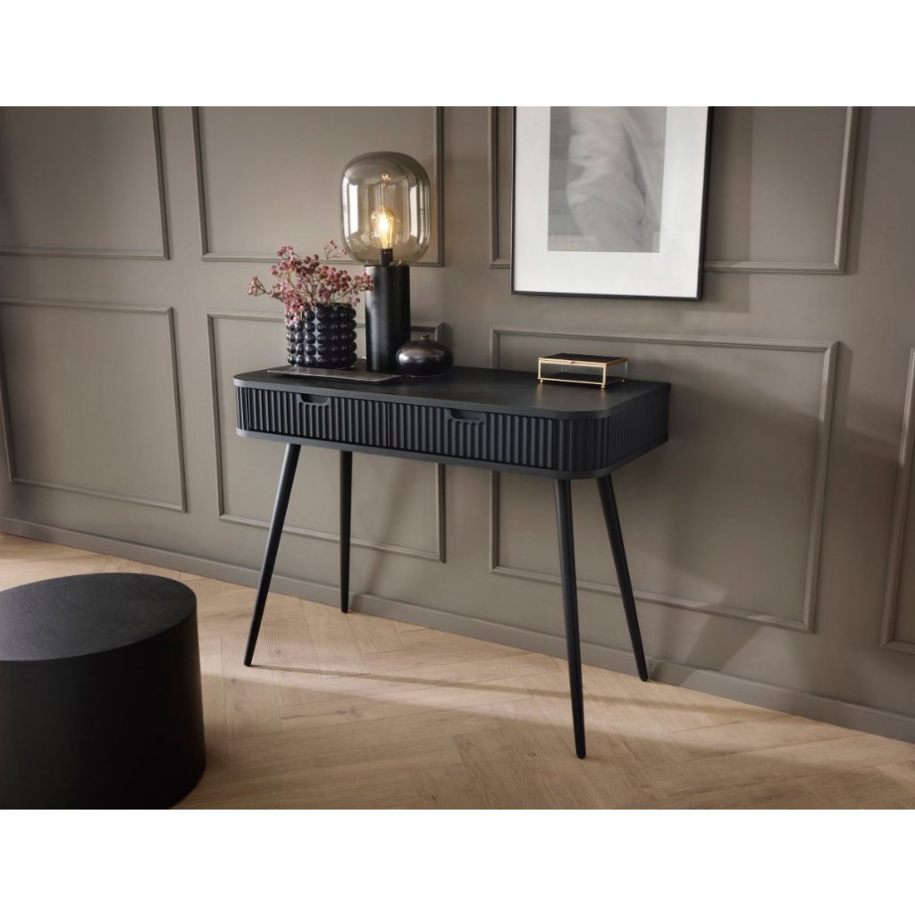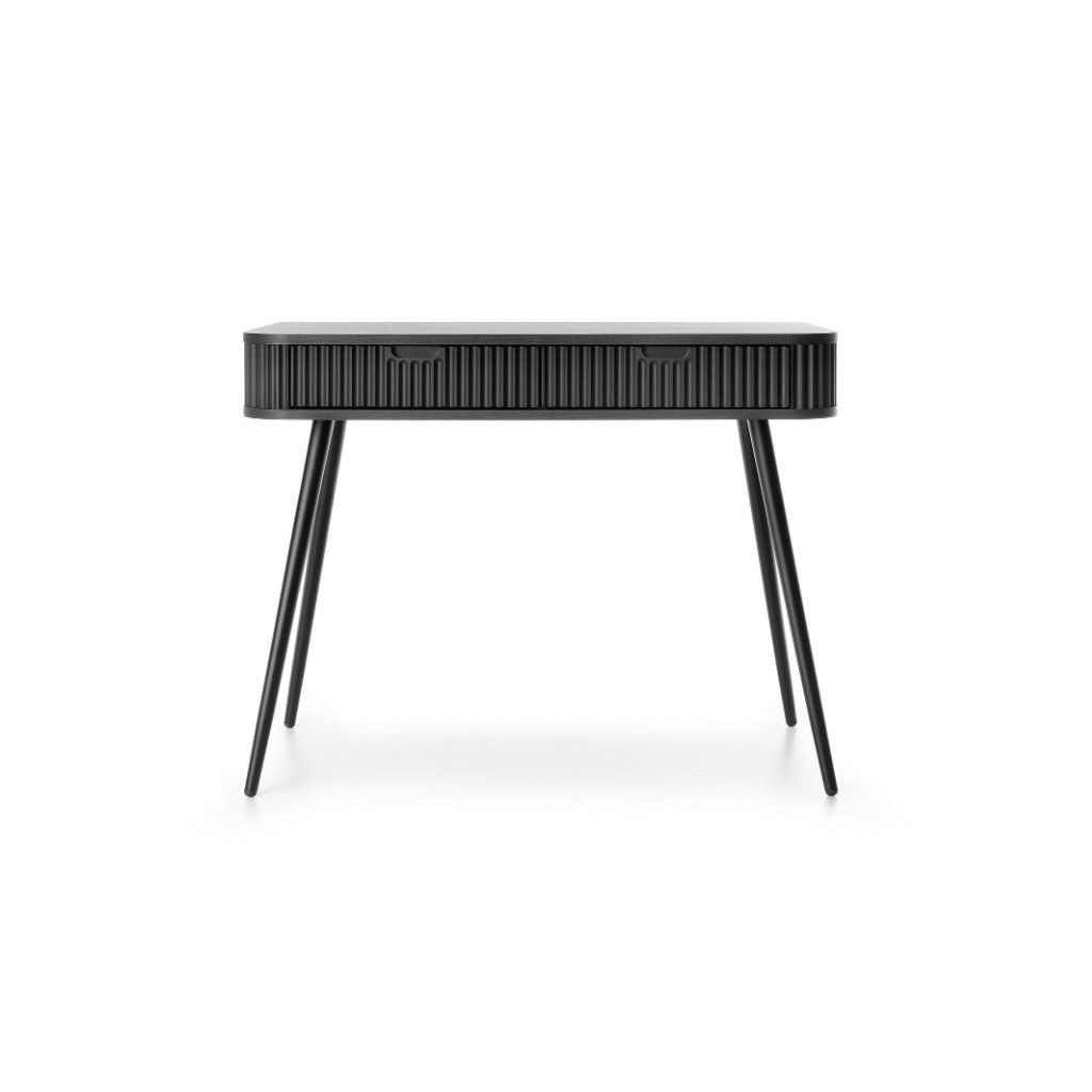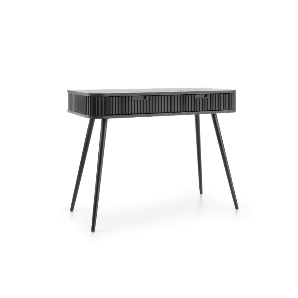 Praktický toaletný stolík ZEVA T-103 v príjemnej čiernej farbe s kombináciou čiernych vysokých nôh v matnom prevedení. Toaletný stolík kombinuje moderný dizajn s praktickými funkciami, čo ju robí ideálnou voľbou pre každý interiér. Toaletný stolík má dve priestranné zásuvky. Nechajte sa inšpirovať našou novou ponukou a vytvorte si príjemný domov.