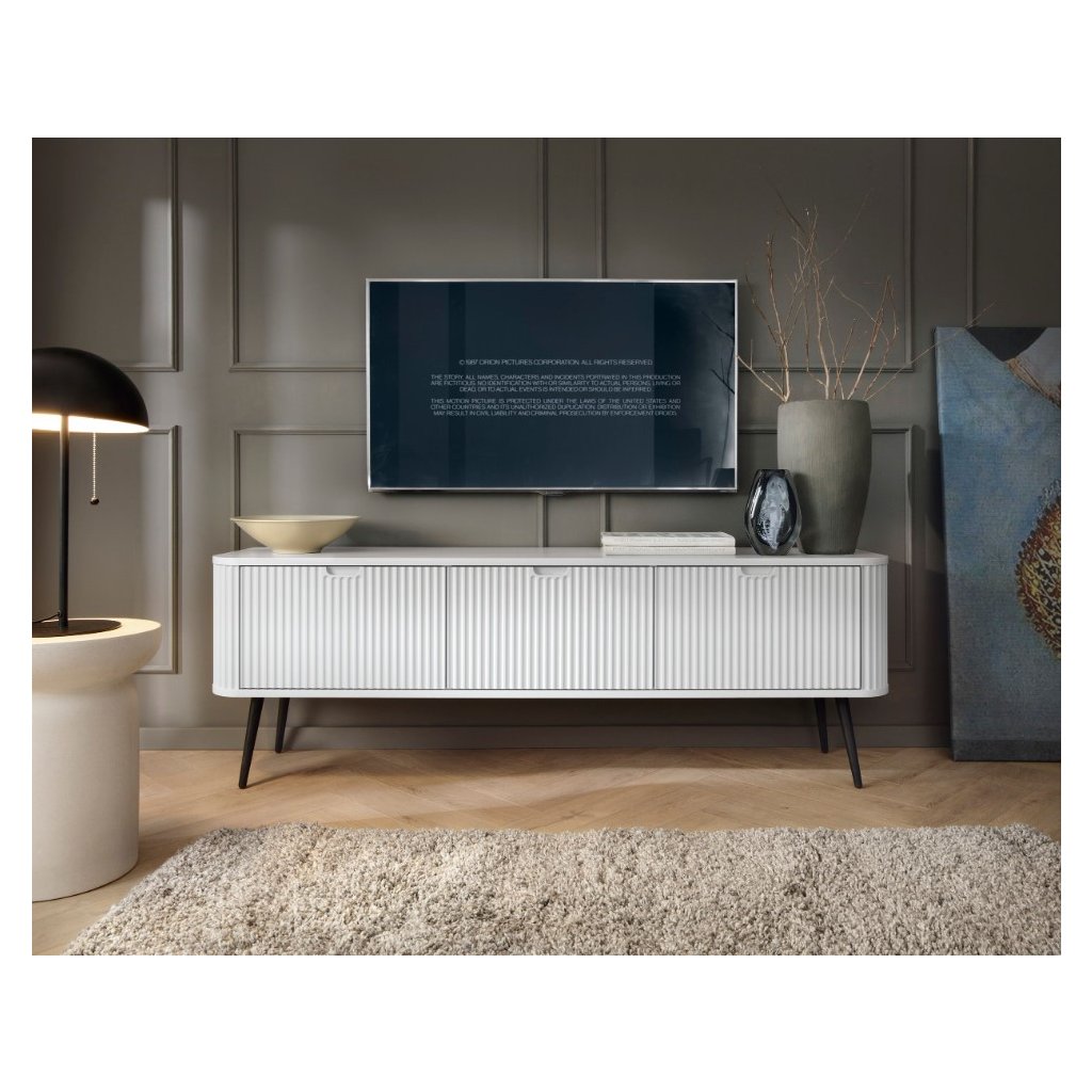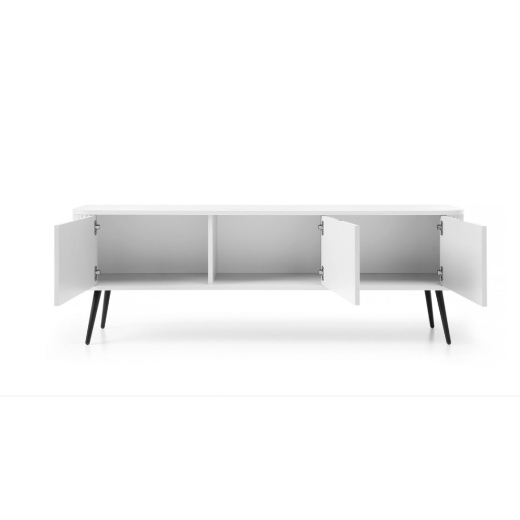 Nadčasový TV stolík ZEVA RTV-168 v príjemnej bielej farbe s kombináciou čiernych vysokých nôh v matnom prevedení. Nohy sú vysoké 23 cm čo je vhodné pre robotický vysávač. TV stolík kombinuje moderný dizajn s praktickými funkciami, čo ju robí ideálnou voľbou pre každý interiér. TV stolík je trojdielny s dvierkami.