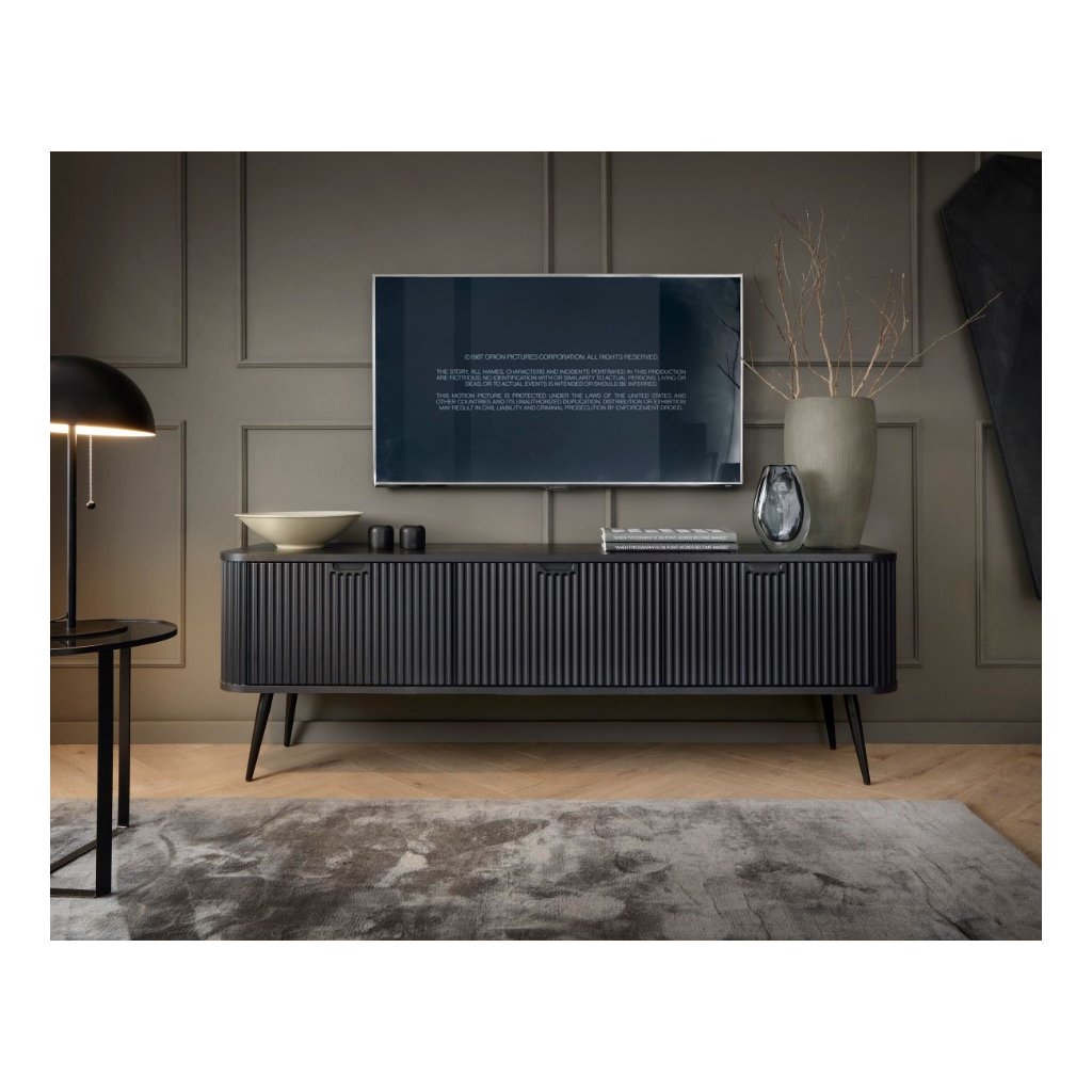 Nadčasový TV stolík ZEVA RTV-168 v populárnej čiernej farbe s kombináciou čiernych vysokých nôh v matnom prevedení. Nohy sú vysoké 23 cm čo je vhodné pre robotický vysávač. TV stolík kombinuje moderný dizajn s praktickými funkciami, čo ju robí ideálnou voľbou pre každý interiér. TV stolík je trojdielny s dvierkami.