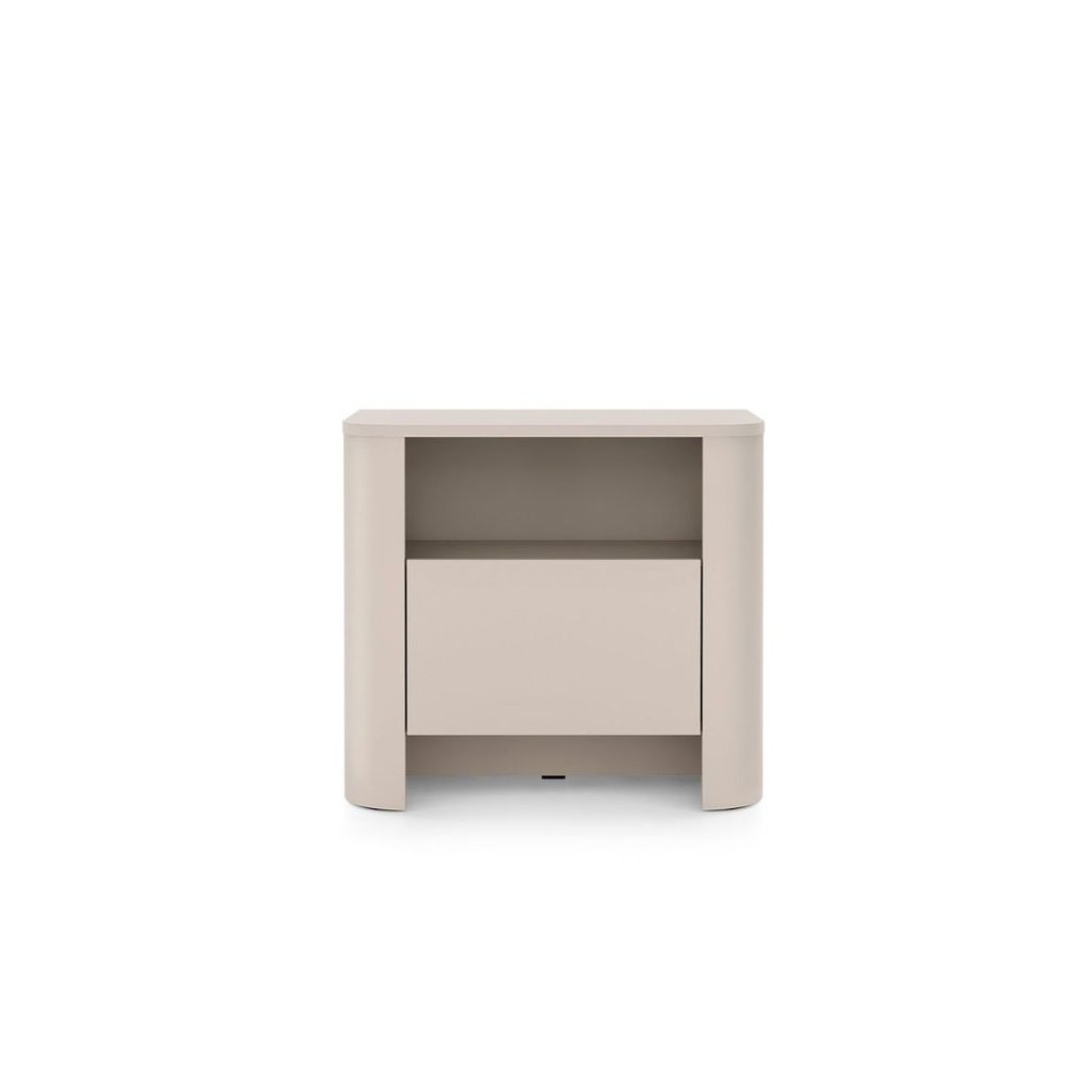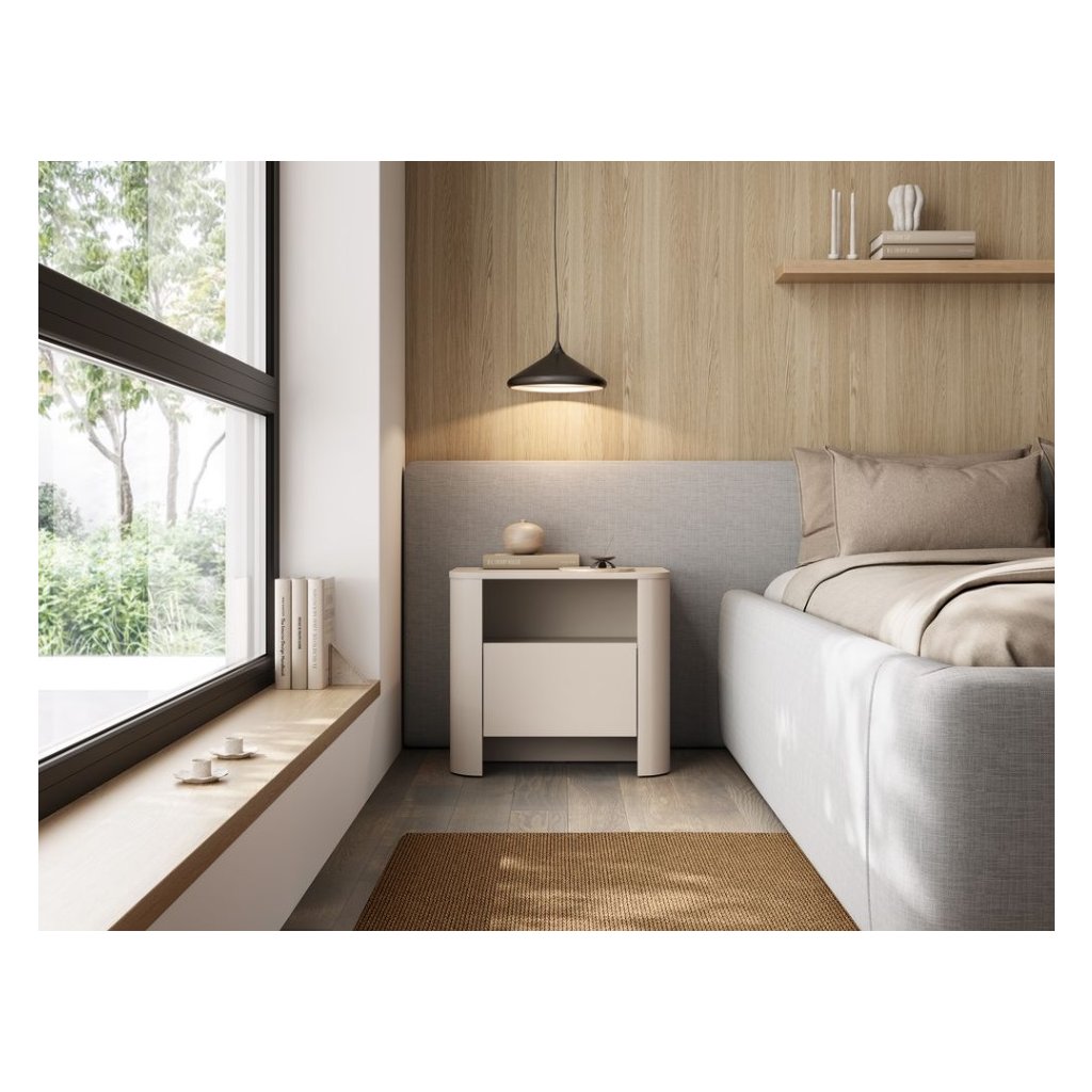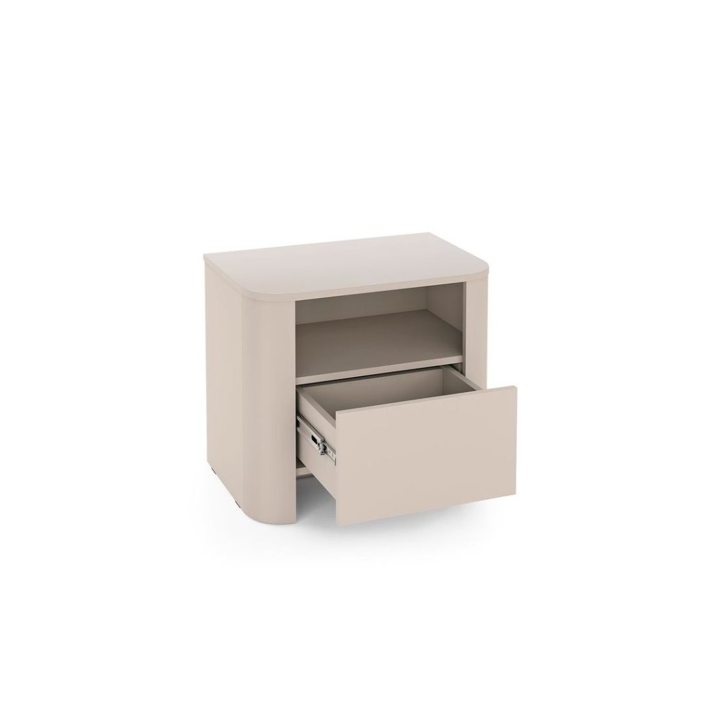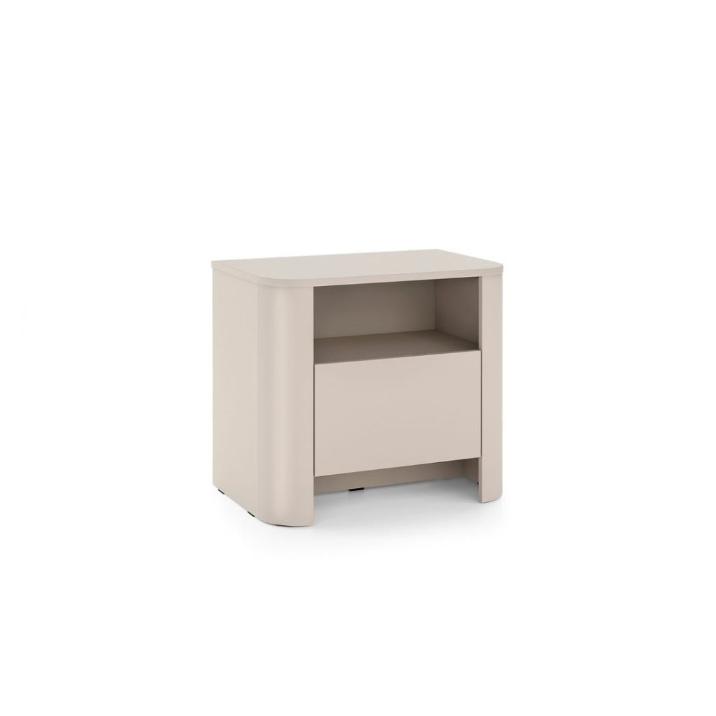 Zostava ABRIN predstavuje moderný a funkčný nábytok, ideálny do spálne alebo izby pre mládež. Umožňuje praktické a esteticky vyvážené usporiadanie priestoru podľa vašich potrieb. Jemné farebné prevedenie cashmere v kombinácii so zaoblenými líniami prináša do interiéru eleganciu, ľahkosť a nadčasový minimalistický štýl. Nočný stolík ABRIN S58 je vybavený otvorenou policou a jednými dvierkami, čo poskytuje praktický priestor na odkladanie drobností. Systém otvárania „push to open“ umožňuje pohodlné a tiché otváranie bez rukovätí, čím zvýrazňuje moderný charakter a čistý dizajn tohto štýlového doplnku do spálne.