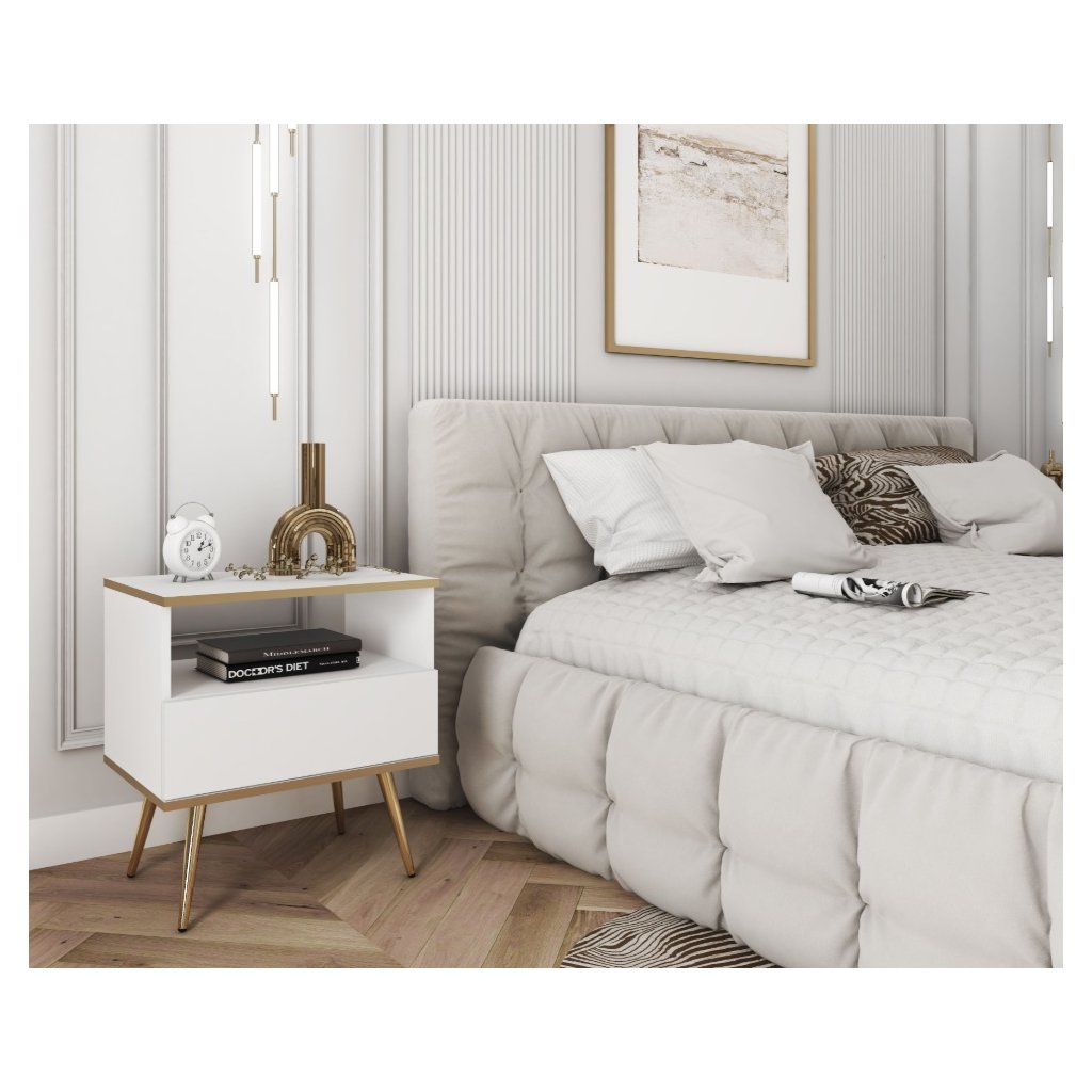 Nočný stolík BIJOU S-54 | biela / zlaté nohy je vyrobený z kvalitných materiálov v kombinácii s MDF. Stolík má pevné nohy a štýlové otváranie. Nohy sú vysoké čo je vhodné pre robotický vysávač. Stolík je jednoduchý na údržbu a čistenie, čím šetrí čas aj náklady spojené s údržbou.
