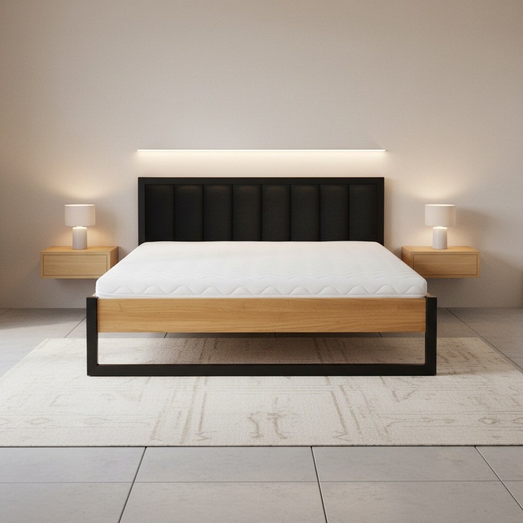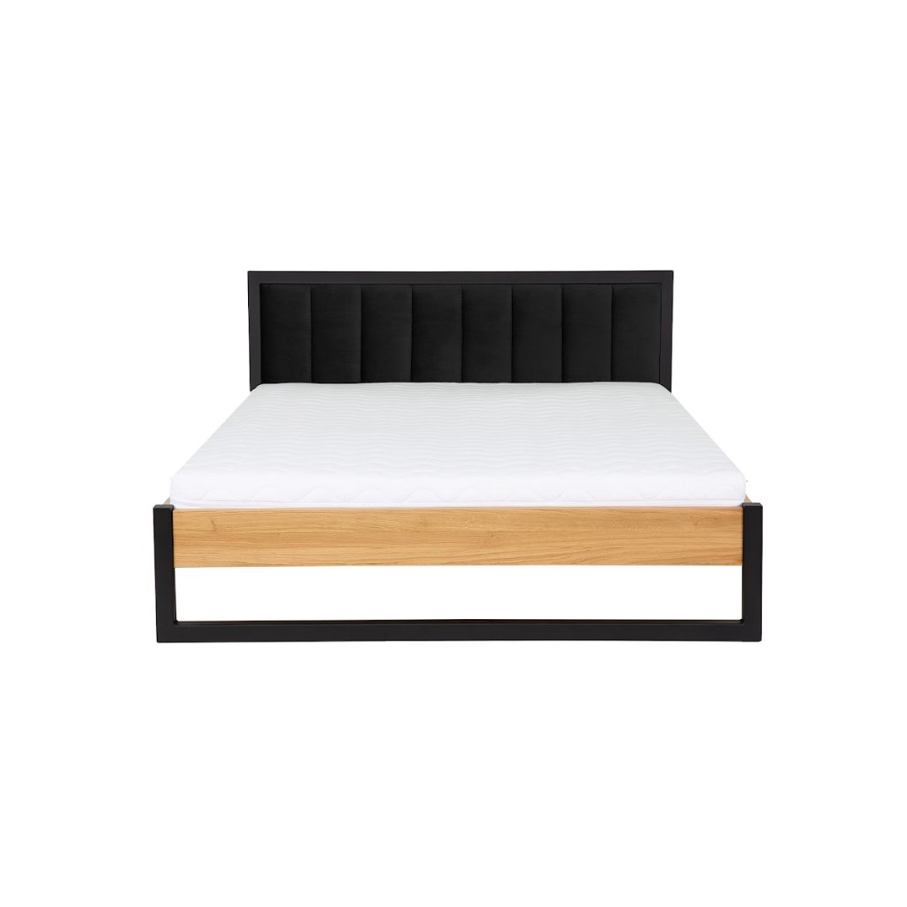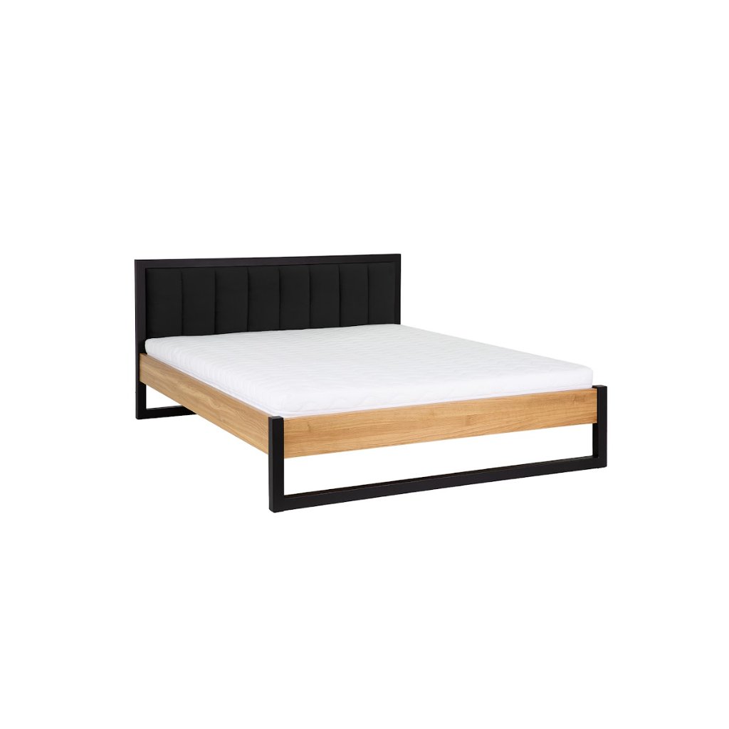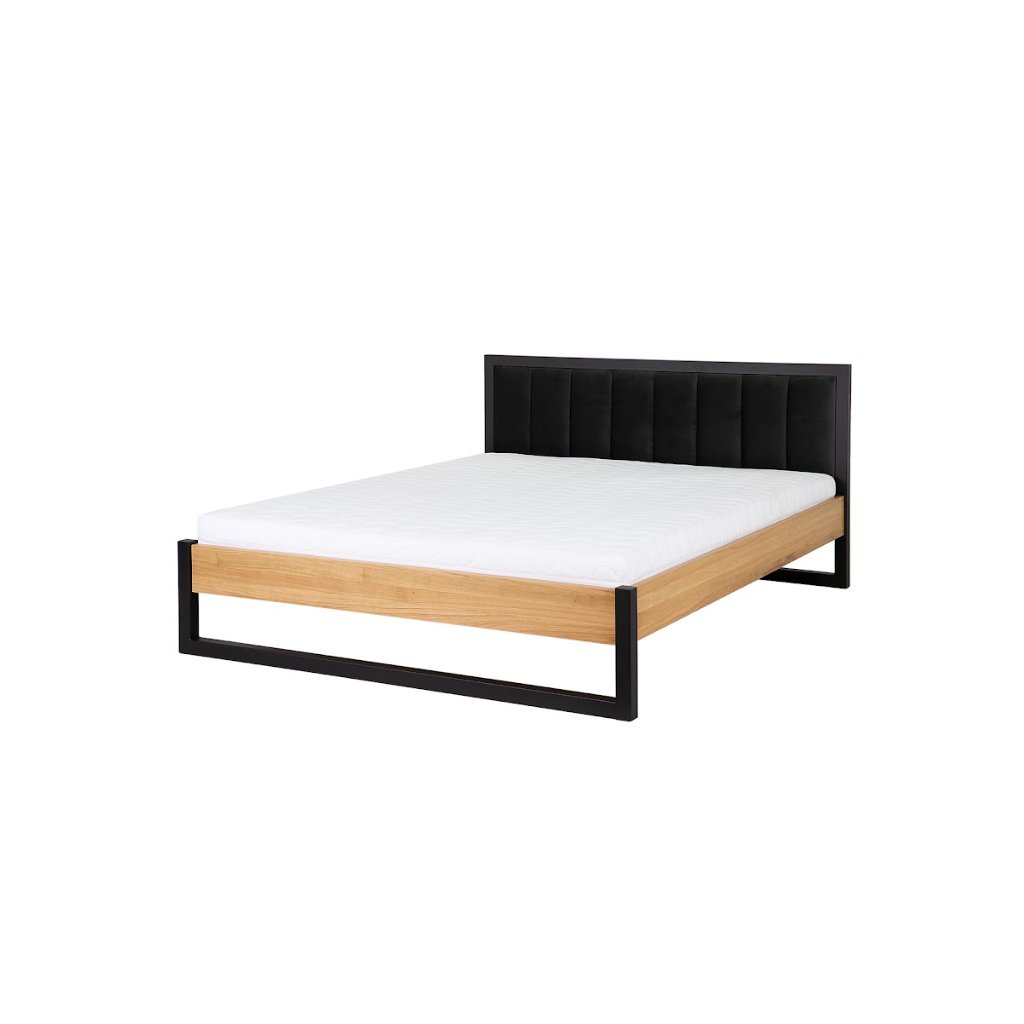 Manželská posteľ LK372 spája teplo masívneho dubového dreva s modernou čiernou kovovou konštrukciou a vysokým čalúneným čelom. Výsledkom je výrazný dizajnový prvok, ktorý dodá spálni charakter a prémiový vzhľad. Mäkké čierne čalúnenie poskytuje komfort pri čítaní alebo relaxe, zatiaľ čo pevný kombinovaný rám zabezpečuje dlhú životnosť a stabilitu. Minimalistické línie a kontrast materiálov robia z postele dominantný prvok modernej, industriálnej alebo loftovej spálne.