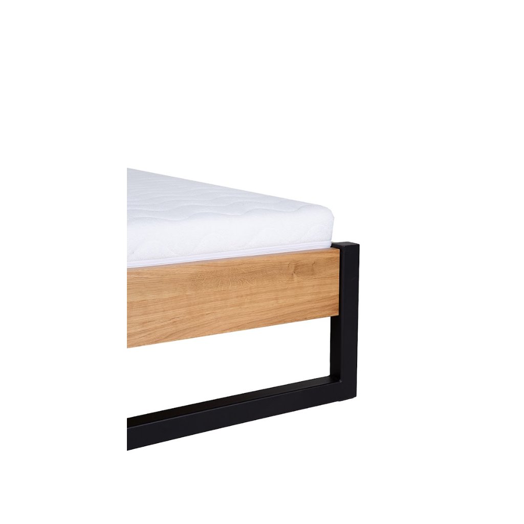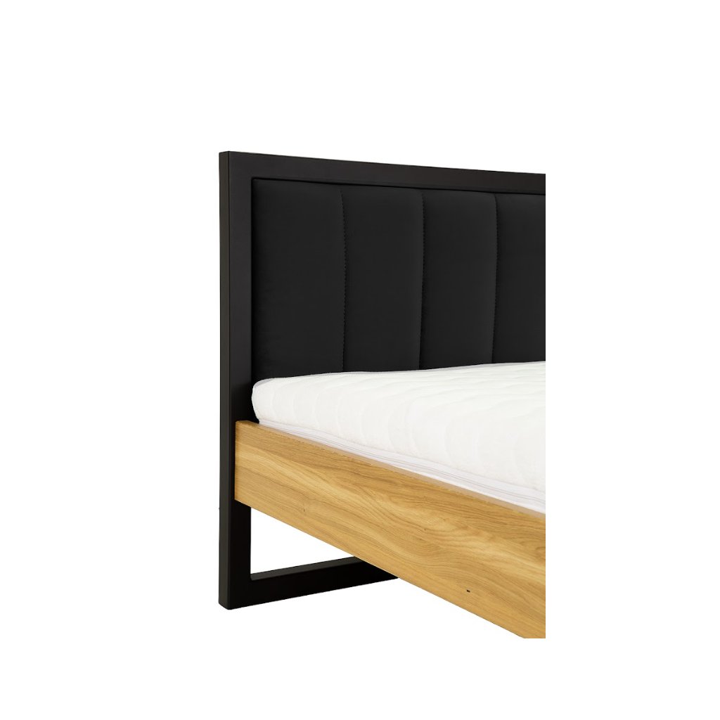 Dubové drevo má charakteristickú jemnú kresbu a teplý zlatohnedý odtieň, ktorý pôsobí prirodzene a útulne. Každý kus dubu je originálny – textúra, letokruhy a prirodzené farebné prechody dodávajú nábytku jedinečný vzhľad. Materiál dub prírodný je jedným z najkvalitnejších a najžiadanejších druhov dreva, používaných pri výrobe nábytku. Vyznačuje sa vysokou tvrdosťou, pevnosťou a odolnosťou, vďaka čomu je mimoriadne trvácny a dlhodobo si zachováva svoj tvar aj pri intenzívnom používaní. V kombinácii s kovom posteľ pôsobí industriálne. Celkový dojem podčiarkuje čalúnené čelo.