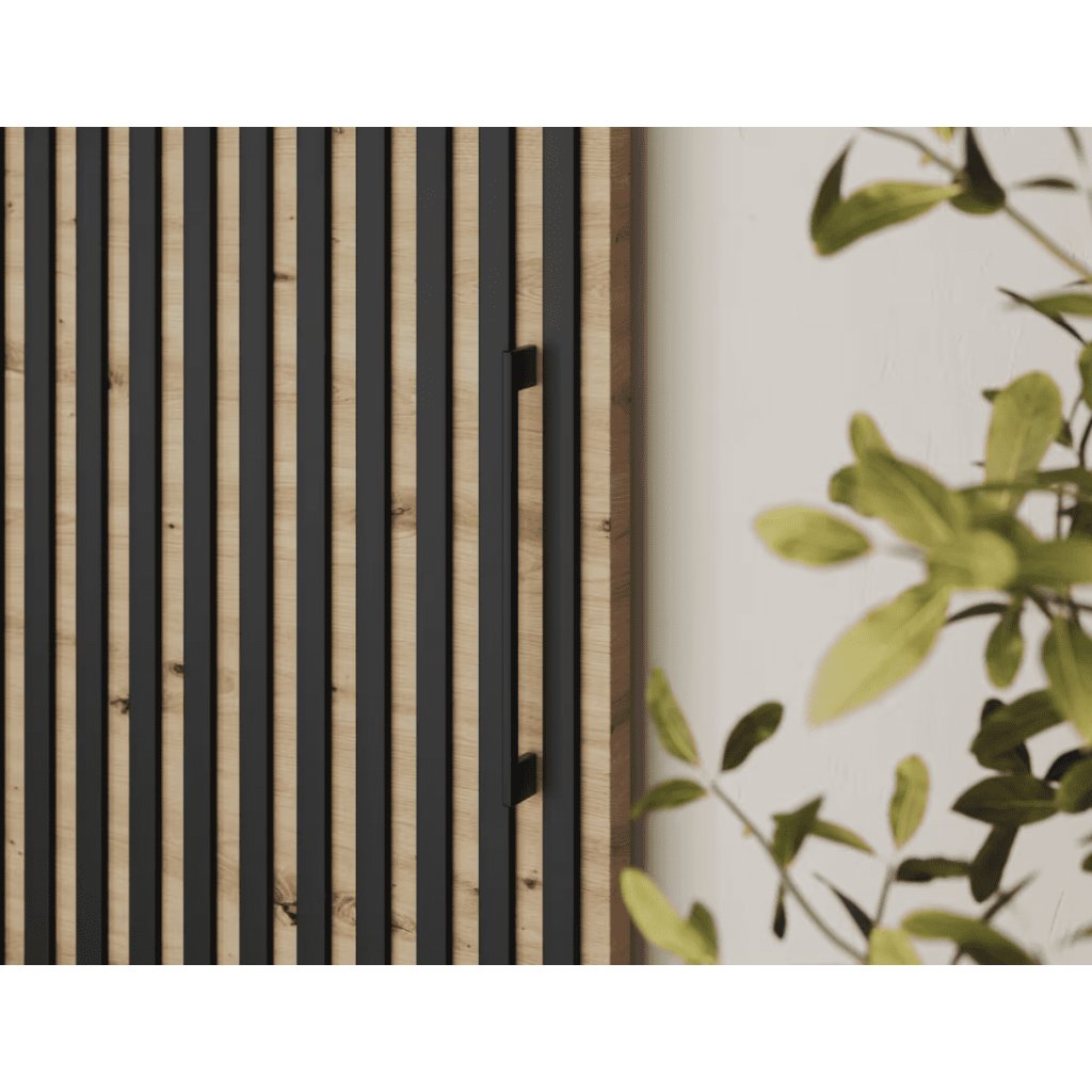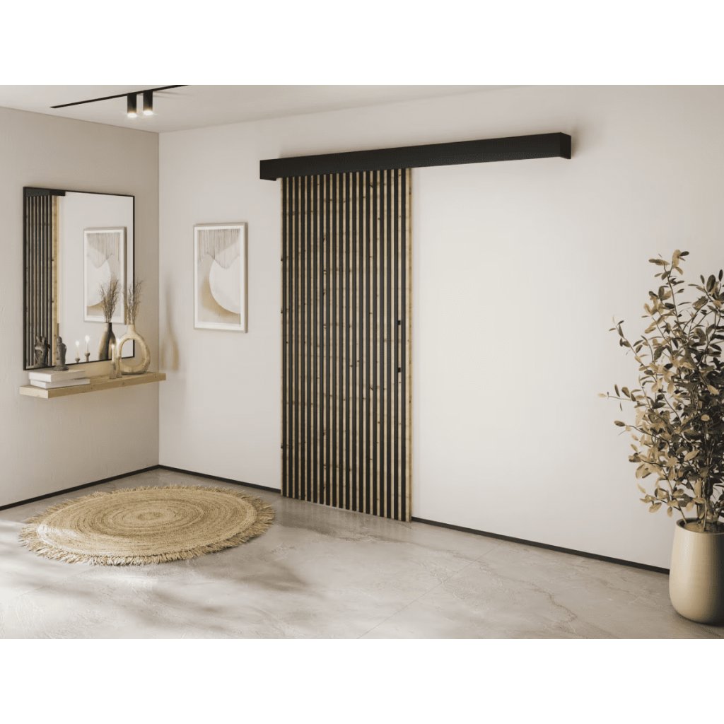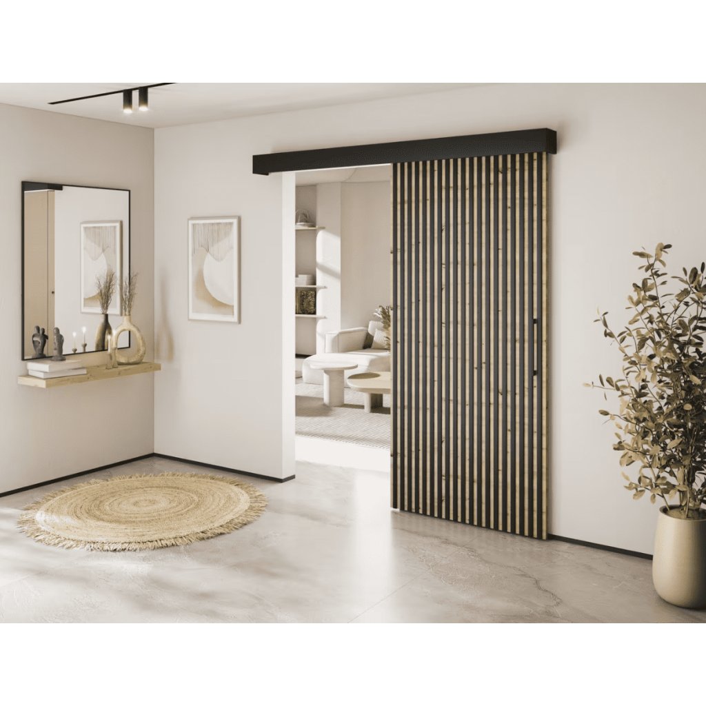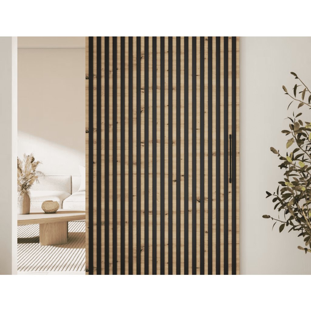 Vneste do svojho domova štýl, svetlo a harmóniu s lamelovými posuvnými dverami TAURICIO, ktoré sa stanú dizajnovou dominantou každého interiéru. Tento model kombinuje prírodný drevodekor s čiernymi lamelami, čím vytvára jedinečný kontrast medzi teplom dreva a moderným industriálnym vzhľadom. Vertikálne čierne lamely im dodávajú hĺbku a eleganciu. Vďaka posuvnému systému po stene sú ideálnym riešením pre priestory, kde je dôležité šetriť miestom – napríklad medzi obývačkou a spálňou, šatníkom či pracovňou. Ich elegantný dizajn, tichý chod a úspora miesta robia z posuvných dverí obľúbený prvok moderného bývania.