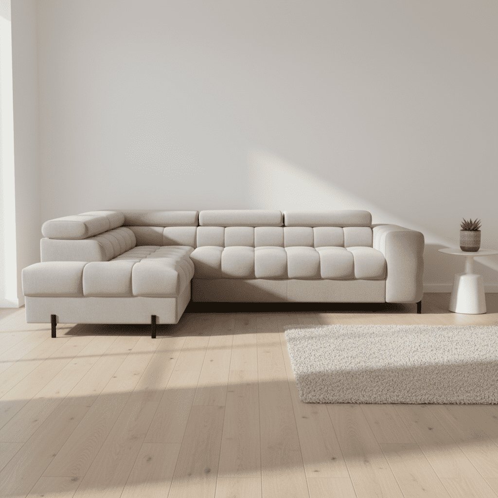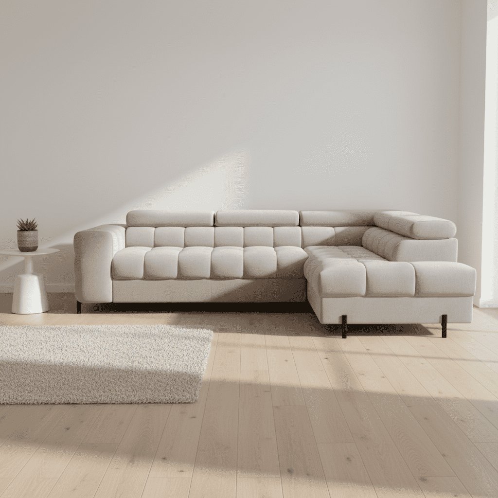 Vychutnajte si dokonalé pohodlie s modernou rohovou sedačkou FERUCCEA, ktorá sa stane dominantou vašej obývačky. Táto elegantná sedačka v neutrálnom odtieni béžovo-sivej farby je ideálnym riešením pre moderné interiéry, ktoré kladú dôraz na minimalizmus, komfort a funkčnosť. Sedačka je vyrobená z kvalitného, mäkkého poťahového materiálu príjemného na dotyk a doplnená o ergonomické operadlá s nastaviteľnými opierkami hlavy, ktoré zabezpečia maximálny relax. Vďaka priestrannému sedaciemu priestoru je ideálna pre rodiny aj návštevy – každý si nájde svoje miesto na oddych.