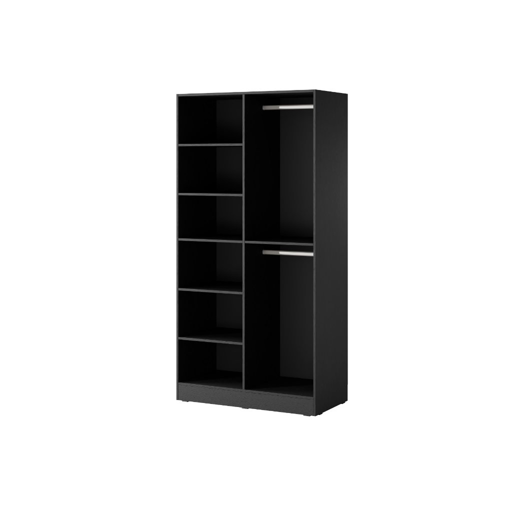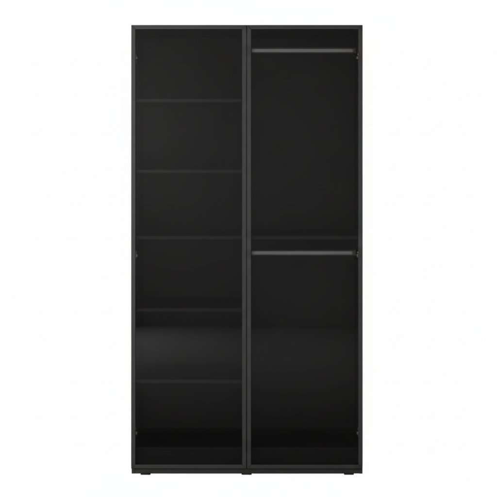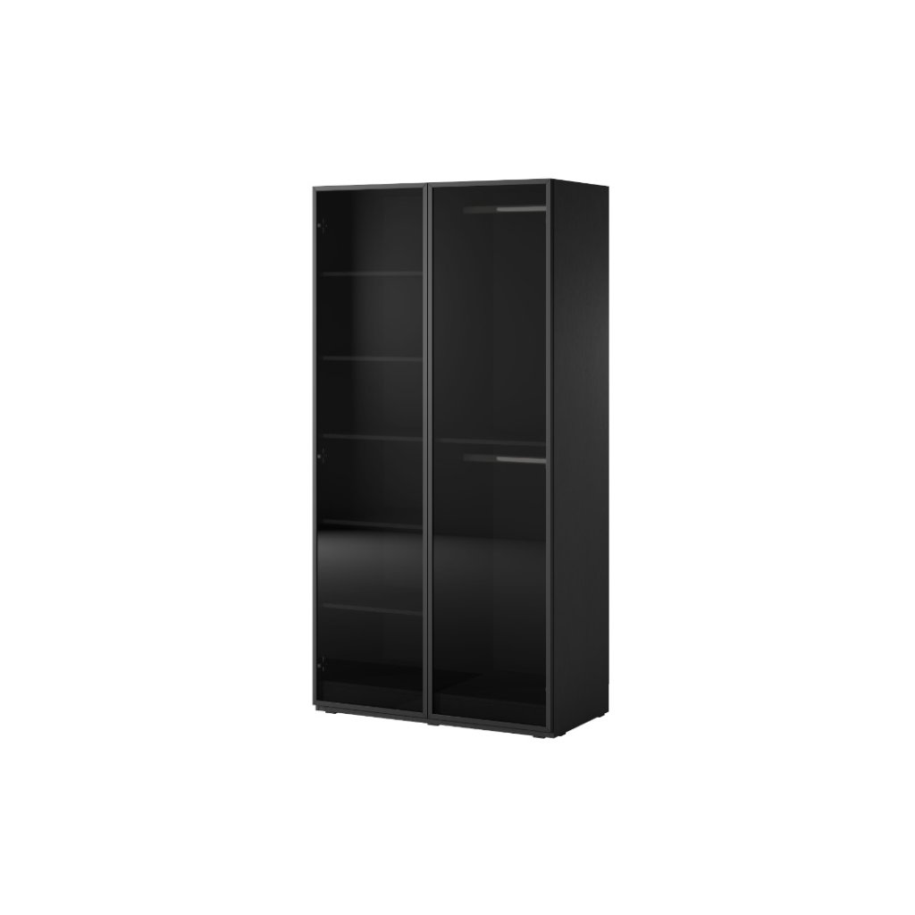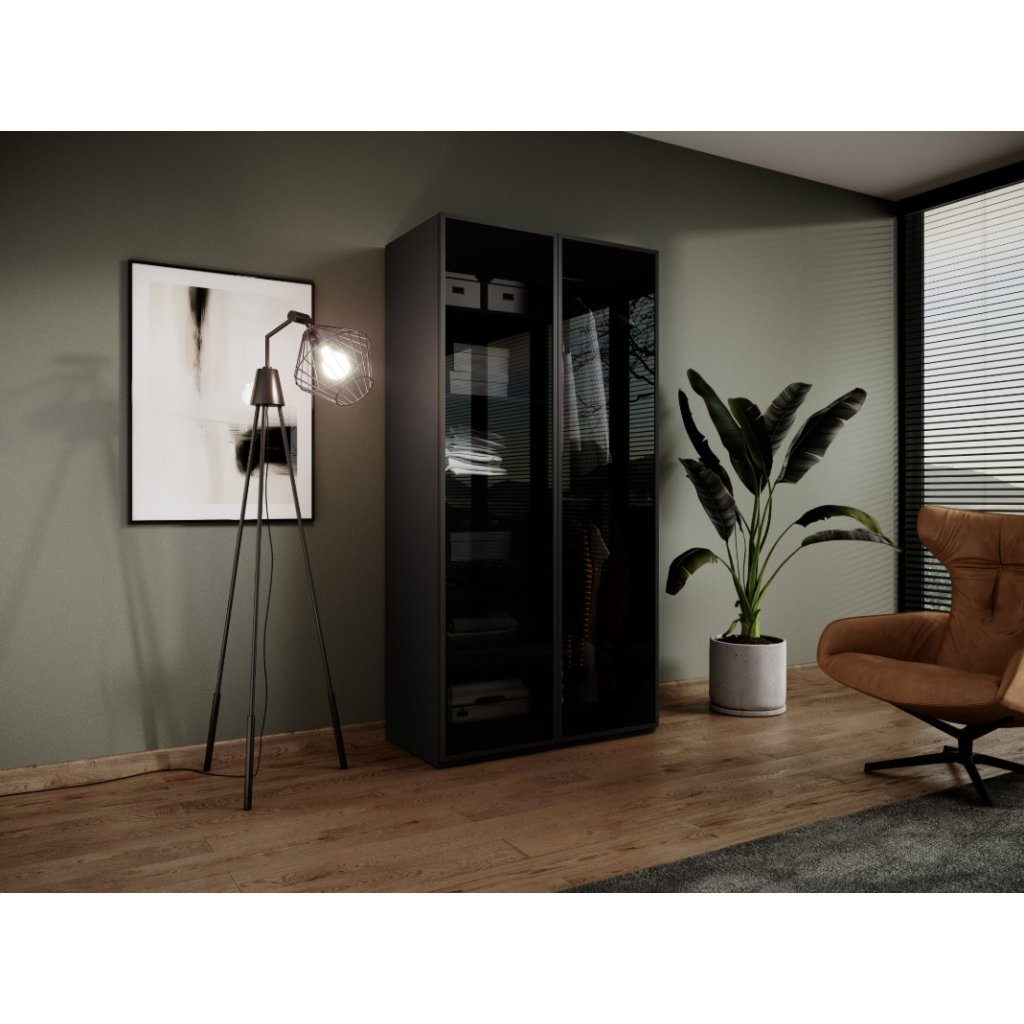 Moderná šatníková skriňa FLEXON s modulárnym dizajnom vám umožní prispôsobiť si úložný priestor podľa vašich potrieb aj rozmerov miestnosti. Elegantné čierne farebné prevedenie v kombinácii so sklenenými dverami ANTISOL vytvára štýlový, nadčasový a exkluzívny vzhľad, ktorý dokonale zapadne do moderného interiéru. Dvere z priehľadného skla, osadené v pevných hliníkových rámoch, pôsobia ľahko a elegantne, pričom zároveň dodávajú skrini luxusný a vzdušný charakter. Vnútorné usporiadanie skrine ponúka praktické police a závesné tyče, ktoré zabezpečujú maximálnu prehľadnosť a dostatok priestoru na uloženie aj zavesenie odevov. Vďaka tomu je skriňa funkčná, prehľadná a esteticky vyvážená.