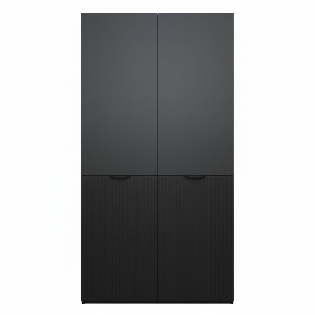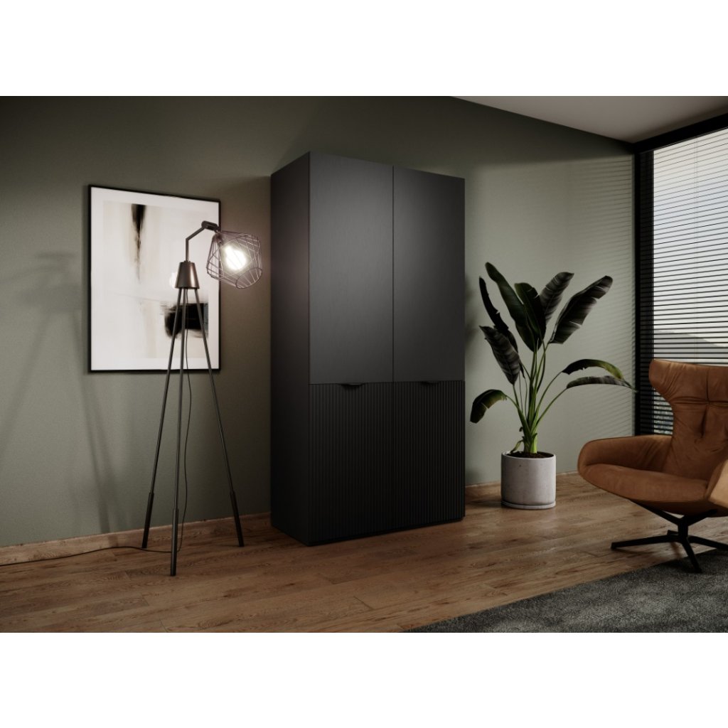 Moderná šatníková skriňa FLEXON s modulárnym dizajnom vám umožní prispôsobiť úložný priestor podľa vašich potrieb aj rozmerov miestnosti. Elegantné čierne farebné prevedenie v kombinácii s frézovanými dverami dodáva interiéru výrazný, štýlový a nadčasový charakter. Praktické čierne hliníkové úchyty podčiarkujú moderný vzhľad skrine a zároveň zaisťujú pohodlné používanie. Vnútorné usporiadanie ponúka kombináciu políc a závesných tyčí, ktoré poskytujú dostatok priestoru na uloženie aj zavesenie odevov, čím zaručujú maximálnu prehľadnosť a funkčnosť.