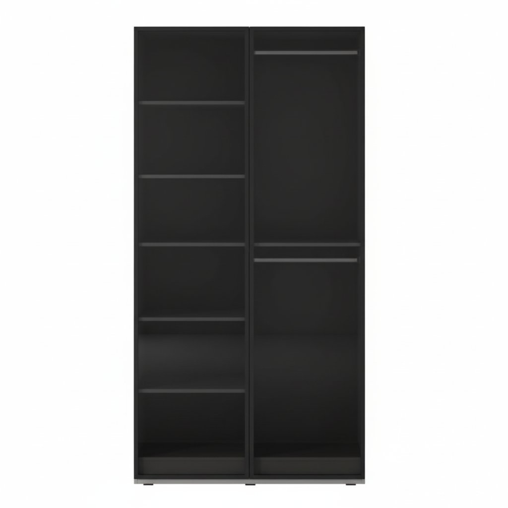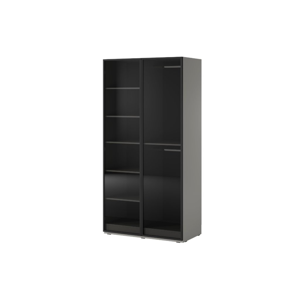 Moderná šatníková skriňa FLEXON s modulárnym dizajnom ponúka možnosť prispôsobiť si úložný priestor podľa vašich potrieb aj rozmerov miestnosti. Elegantné sivé farebné prevedenie v kombinácii so sklenenými dverami ANTISOL pôsobí štýlovo, nadčasovo a exkluzívne, čím sa skriňa dokonale hodí do moderného interiéru. Dvere z priehľadného skla, osadené v pevných hliníkových rámoch, dodávajú skrini ľahkosť a vzdušný vzhľad, zároveň pôsobia elegantne a minimalisticky. Ich precízne spracovanie podčiarkuje vysokú kvalitu a moderný dizajn. Vnútorné usporiadanie ponúka praktické police a závesné tyče, ktoré poskytujú dostatok priestoru na zavesenie aj uloženie odevov, vďaka čomu je skriňa funkčná, prehľadná a esteticky vyvážená.