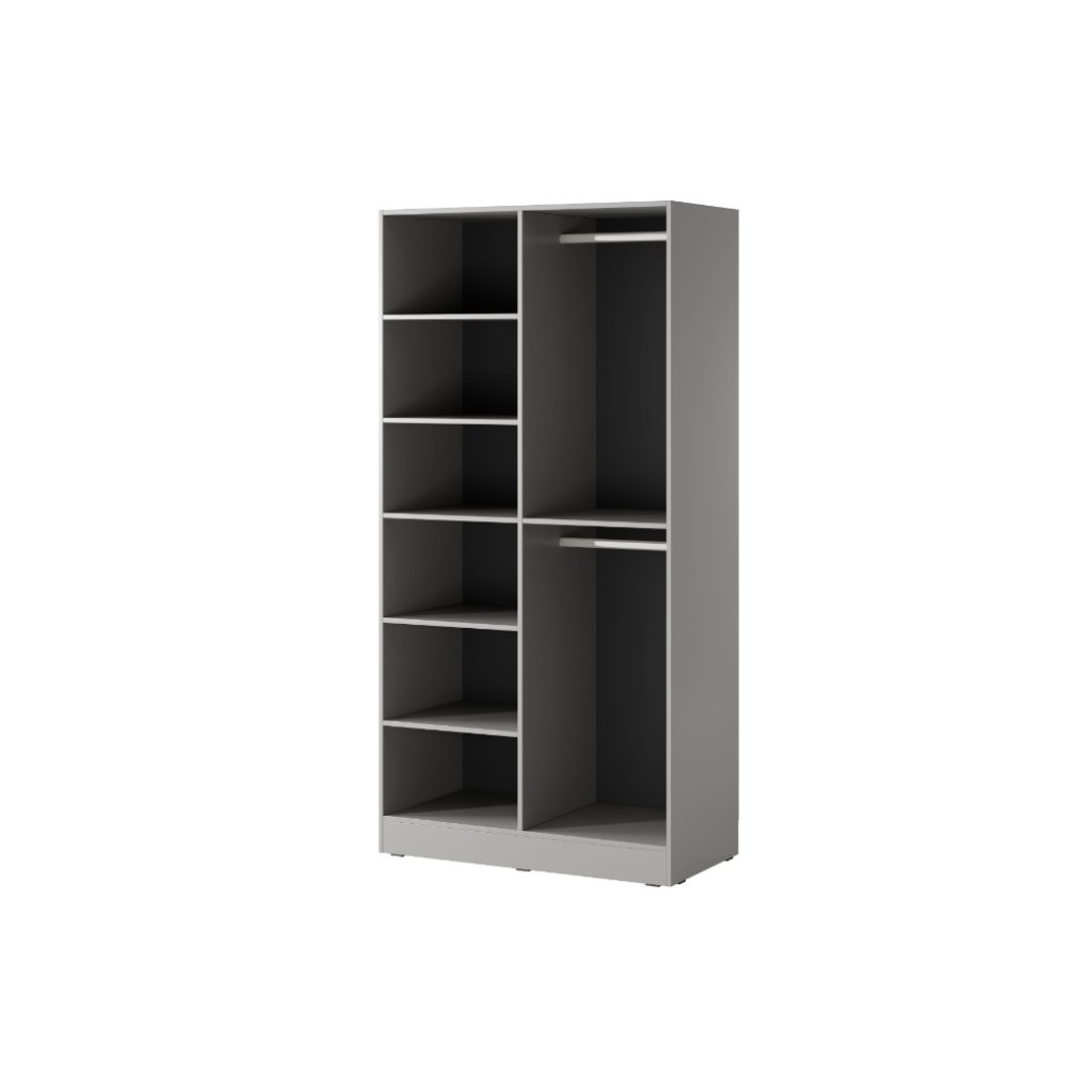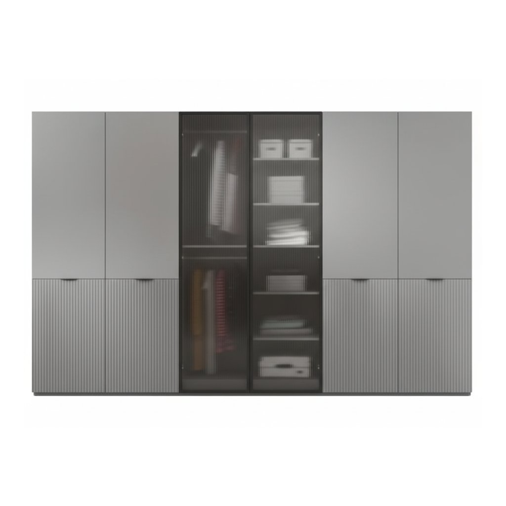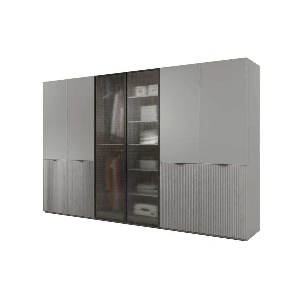 Moderná šatníková zostava FLEXON I s modulárnym dizajnom vám umožní prispôsobiť úložný priestor podľa vašich potrieb aj rozmerov miestnosti. Elegantné sivé farebné prevedenie v kombinácii s frézovanými dverami a vrúbkovanými dverami so sklom vytvára harmonický, moderný a nadčasový vzhľad, ktorý dokonale zapadne do každého interiéru. Praktické čierne hliníkové úchyty podčiarkujú moderný dizajn a zároveň zaisťujú pohodlné používanie. Vnútorné usporiadanie skríň ponúka praktické police a závesné tyče, ktoré poskytujú dostatok priestoru na uloženie aj zavesenie odevov. Kolekcia FLEXON I spája funkčnosť, elegantný vzhľad a prémiové spracovanie, vďaka čomu je ideálnou voľbou pre tých, ktorí hľadajú praktický a štýlový úložný systém s dôrazom na detail a dizajn.