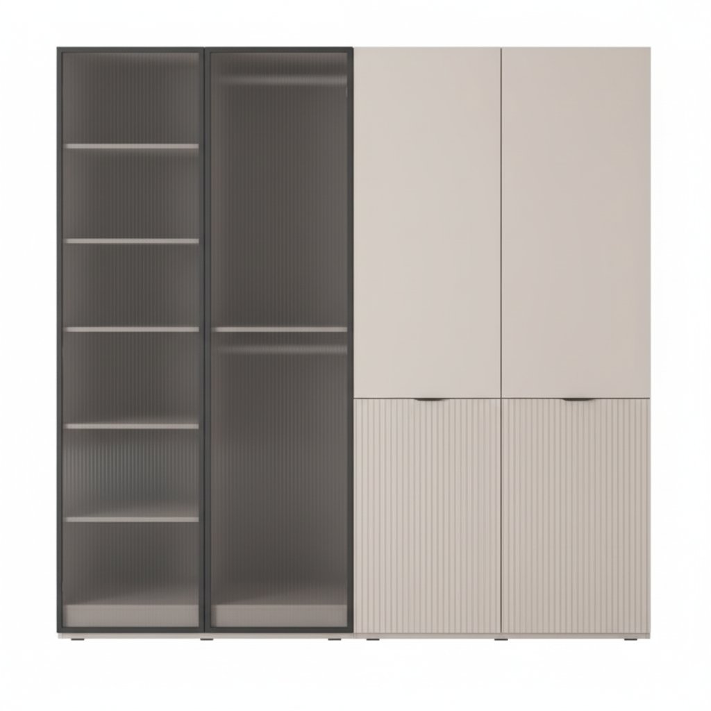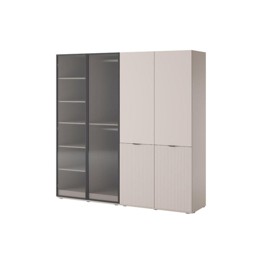 Moderná šatníková zostava FLEXON s modulárnym dizajnom vám umožní prispôsobiť úložný priestor podľa vašich potrieb aj rozmerov miestnosti. Elegantné farebné prevedenie cashmere v kombinácii s frézovanými dverami a vrúbkovanými dverami so sklom vytvára harmonický a nadčasový vzhľad, ktorý dokonale zapadne do každého moderného interiéru. Praktické čierne hliníkové úchyty podčiarkujú moderný charakter zostavy a dodávajú jej jemný kontrast a eleganciu. Vnútorné usporiadanie ponúka kombináciu políc a závesných tyčí, ktoré poskytujú dostatok priestoru na uloženie aj zavesenie odevov, čím zaručujú maximálnu prehľadnosť a komfort pri používaní. Kolekcia FLEXON spája funkčnosť, kvalitné spracovanie a moderný dizajn, vďaka čomu je ideálnou voľbou pre tých, ktorí hľadajú praktický a esteticky vyladený úložný systém.