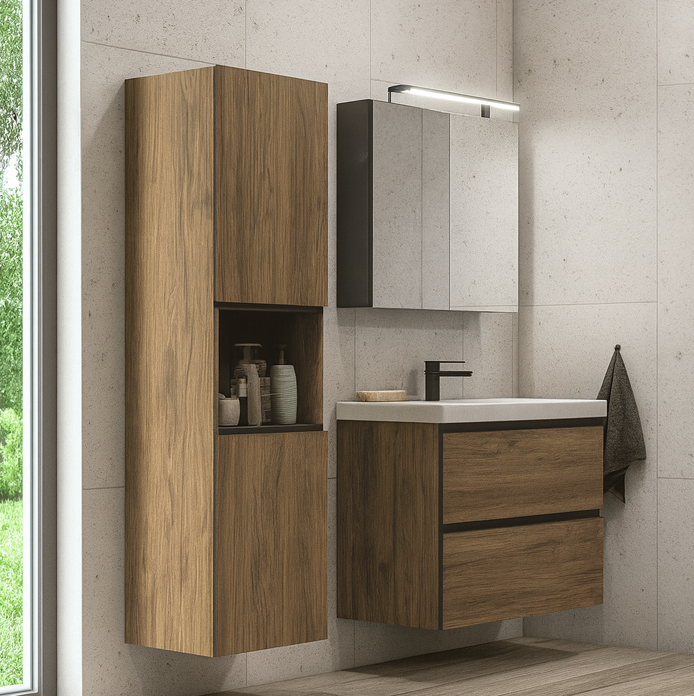 Chcete do svojej kúpeľne vniesť teplo a dotyk luxusu? Kúpeľňové skrinky LOZANO v dekore orech rockford sú ideálnou voľbou pre milovníkov elegantného a pritom decentného štýlu. Tento jedinečný odtieň dreva s výraznou kresbou a hrejivými tónmi sa dokonale hodí do moderných aj klasických interiérov. Kolekcia skvelo ladí s bielou sanitou, čiernymi doplnkami či kovovými detailmi a pre harmonický celok ju môžete kombinovať so svetlou dlažbou alebo prírodným kameňom.