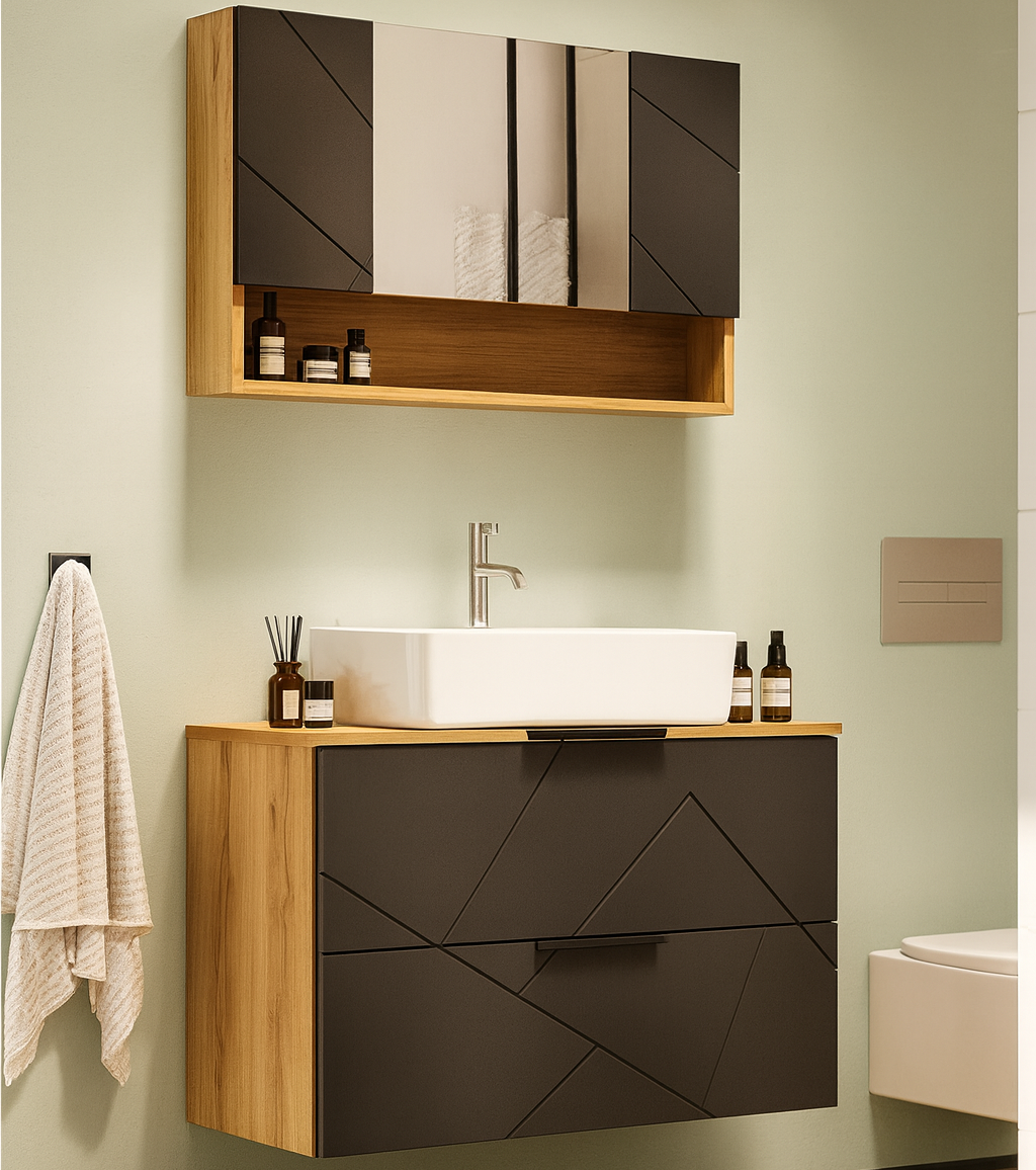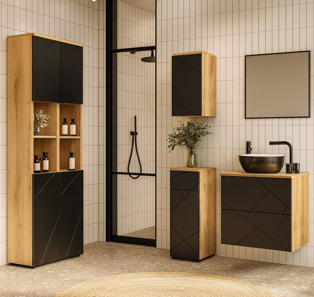 Objavte kúpeľňovú kolekciu MAZI – štýlovú kombináciu moderného dizajnu a praktickej elegancie. Predné časti s jemným frézovaním prinášajú do priestoru originálny detail, zatiaľ čo minimalistické línie a prírodná textúra dreva kontrastujú s čiernymi prvkami. Tento prepracovaný súlad zvýrazňuje moderný charakter kúpeľne a dodáva jej jedinečný šarm. Kolekcia MAZI je navrhnutá tak, aby sa dokonale hodila aj do menších kúpeľní – spája funkčnosť s estetikou a vytvára harmonické prostredie, v ktorom sa budete cítiť príjemne každý deň.