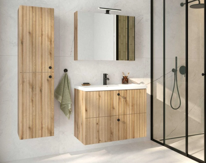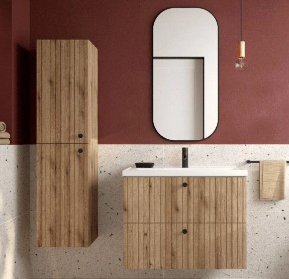 Hľadáte kúpeľňový nábytok, ktorý zaujme vzhľadom a zároveň vás nesklame ani po rokoch používania? Skrinky RIETTI OAK EVOKE spájajú odolné materiály, moderný dizajn a praktické detaily. Čierne kovové úchytky podčiarkujú ich industriálny štýl a zároveň zabezpečujú pohodlné otváranie. Či už zariadujete menšiu kúpeľňu alebo priestranný interiér, kolekcia RIETTI OAK EVOKE ponúka funkčné riešenia pre každý priestor. Doprajte si kúpeľňu, ktorá spája kvalitu, eleganciu a nadčasovú modernosť.