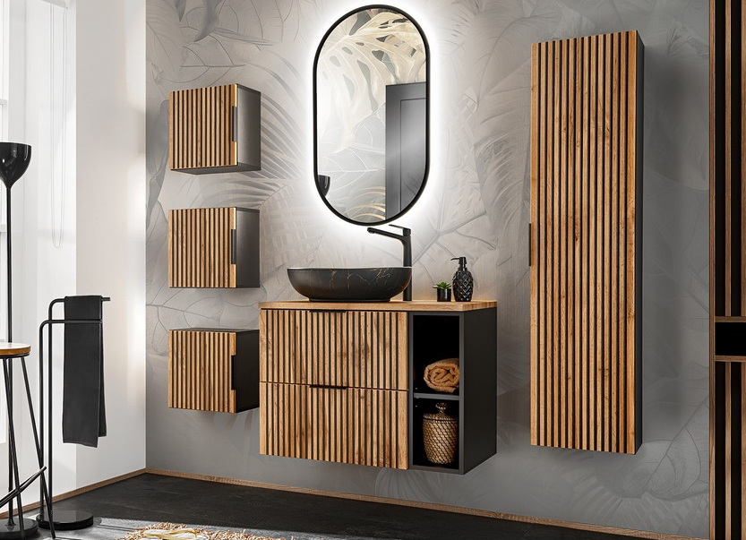 Kúpeľňa dnes nie je len funkčný priestor – čoraz viac sa mení na zónu oddychu. O to dôležitejšie je zvoliť kúpeľňový nábytok, ktorý dobre vyzerá a zároveň je praktický v každodennom používaní. Kolekcia XILO v dekore dub wotan s výraznou kresbou dreva a čiernymi drážkami dodá interiéru prirodzené teplo aj jedinečný charakter. Kontrast tmavých detailov s dubovým povrchom pôsobí elegantne a jemne industriálne, vďaka čomu kúpeľňa získa moderný, štýlový výraz. Skrinky pod umývadlo, regály aj závesné skrinky z kolekcie XILO sú navrhnuté tak, aby ste mali kozmetiku a toaletné potreby vždy prehľadne uložené a po ruke. Kvalitné spracovanie a odolné materiály zároveň zabezpečujú dlhú životnosť a spoľahlivú odolnosť voči vlhkosti, ktorá je v kúpeľni kľúčová.