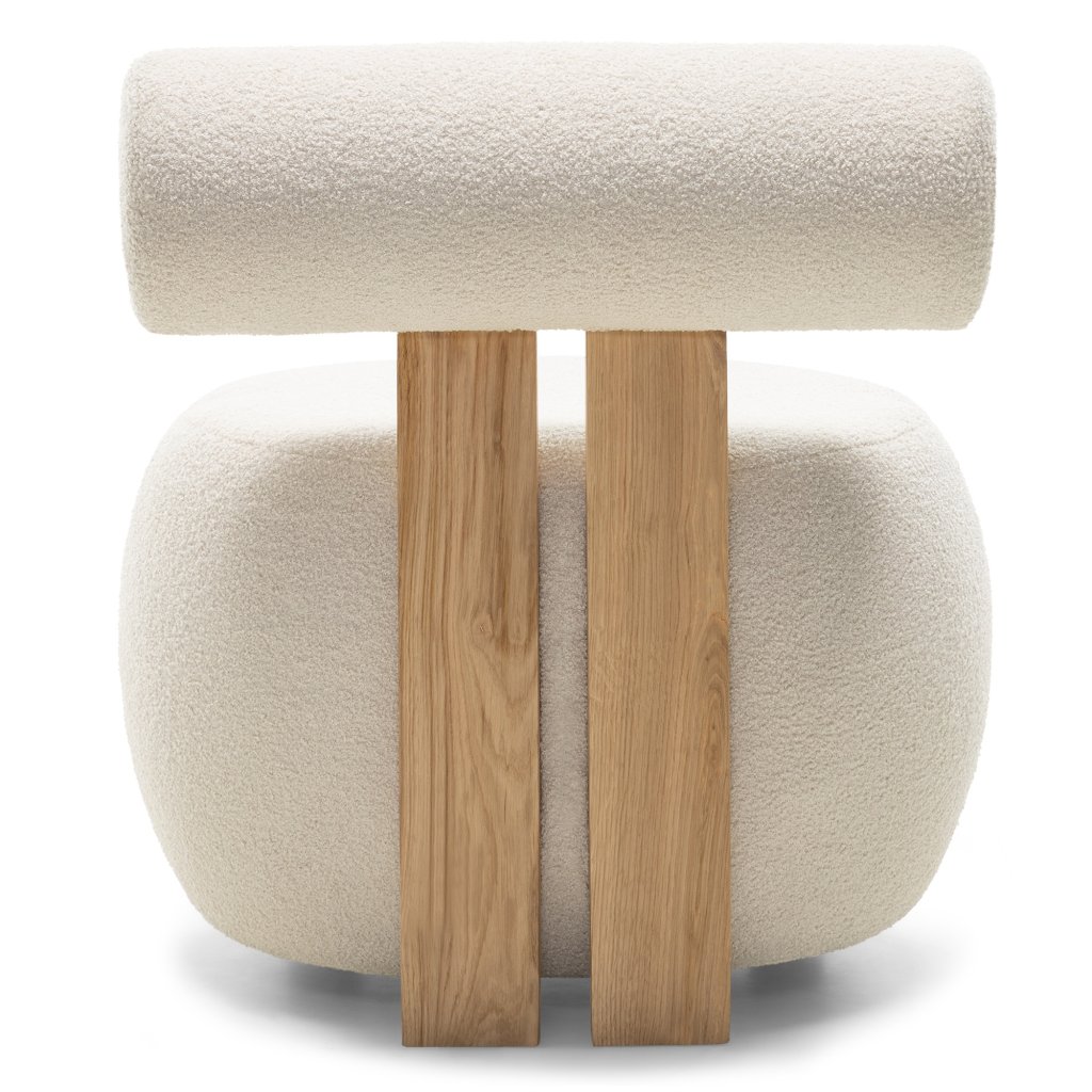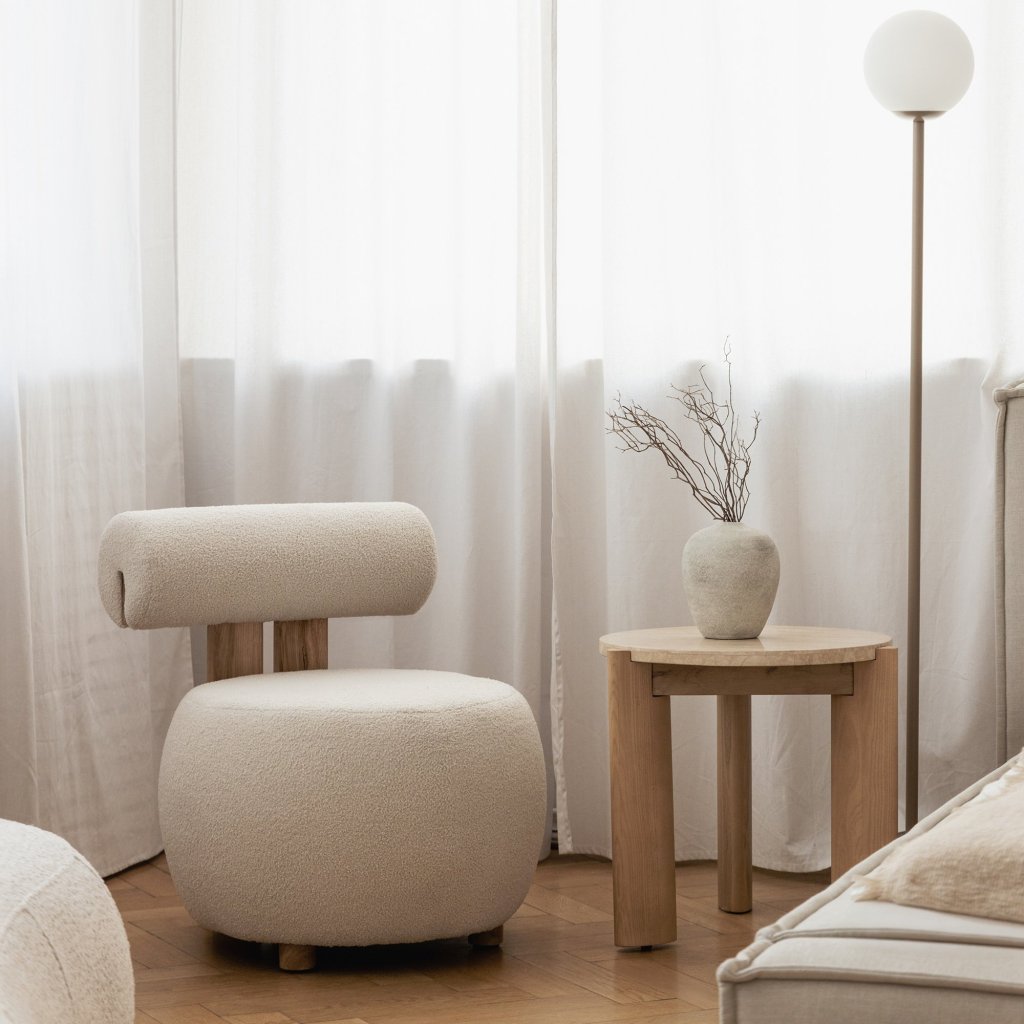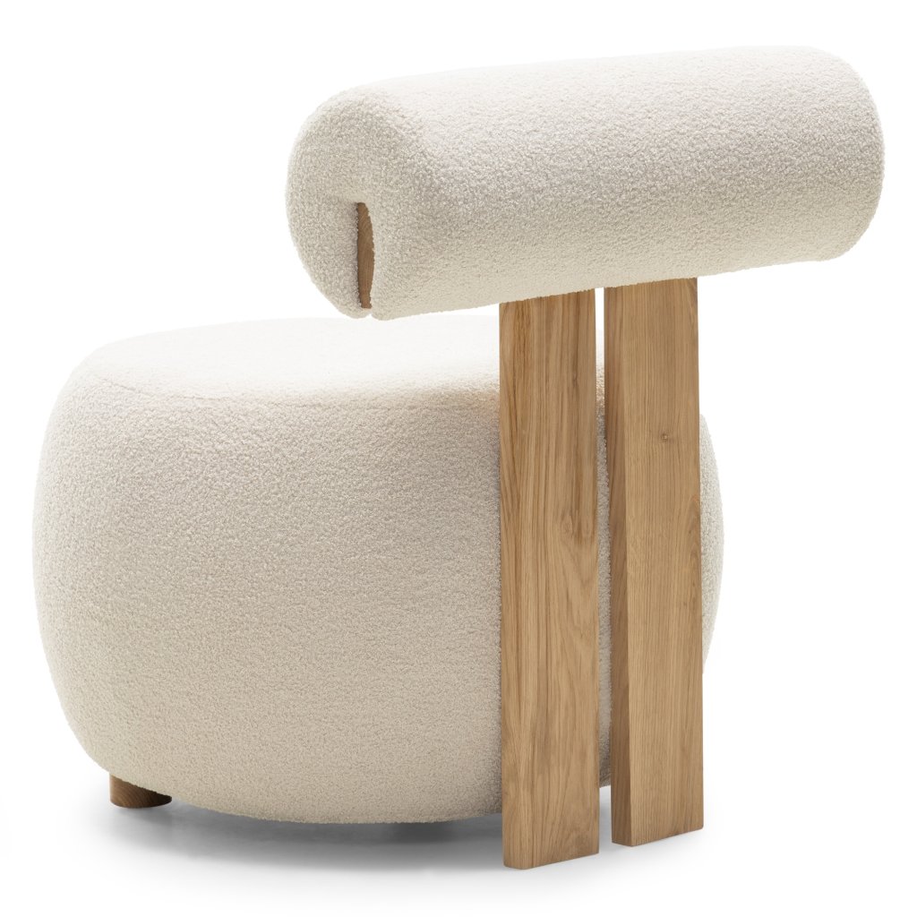 Moderné kreslo s čalúnením z látky bouclé upúta svojím originálnym dizajnom a oblými tvarmi, ktoré pôsobia mimoriadne elegantne a útulne. Mäkké sedadlo a valcovité operadlo poskytujú vysoký komfort pri sedení, zatiaľ čo drevené prvky dodávajú kreslu prirodzený šarm a stabilitu. Vďaka minimalistickému prevedeniu sa stane výrazným doplnkom moderného interiéru – perfektne zapadne do obývačky, spálne aj štýlovej lounge zóny.