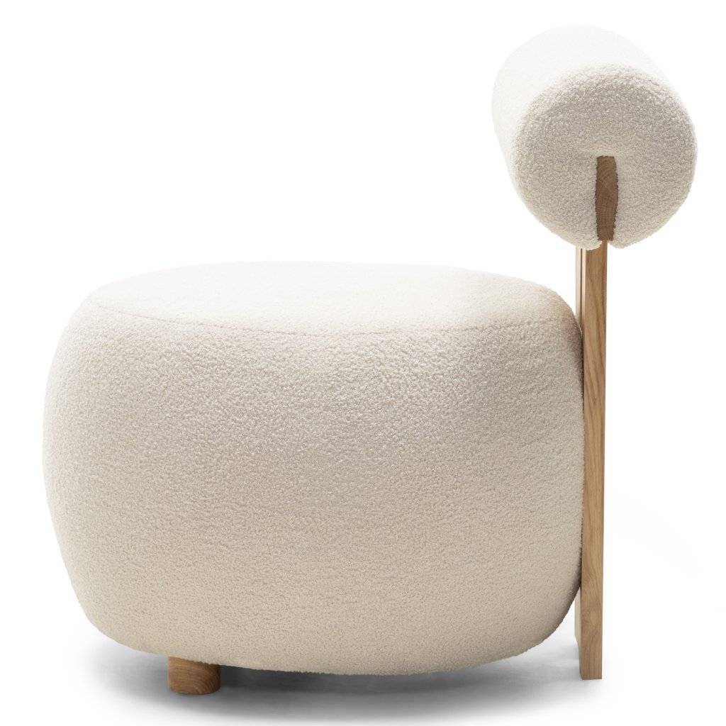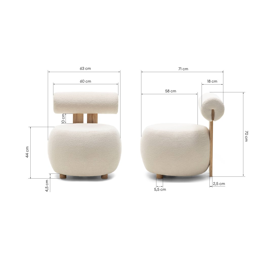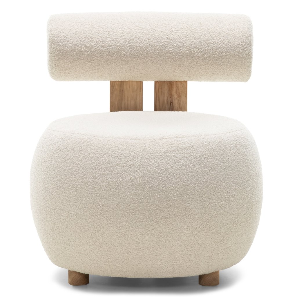 Moderné kreslo s čalúnením z látky bouclé upúta svojím originálnym dizajnom a oblými tvarmi, ktoré pôsobia mimoriadne elegantne a útulne. Mäkké sedadlo a valcovité operadlo poskytujú vysoký komfort pri sedení, zatiaľ čo drevené prvky dodávajú kreslu prirodzený šarm a stabilitu. Vďaka minimalistickému prevedeniu sa stane výrazným doplnkom moderného interiéru – perfektne zapadne do obývačky, spálne aj štýlovej lounge zóny.